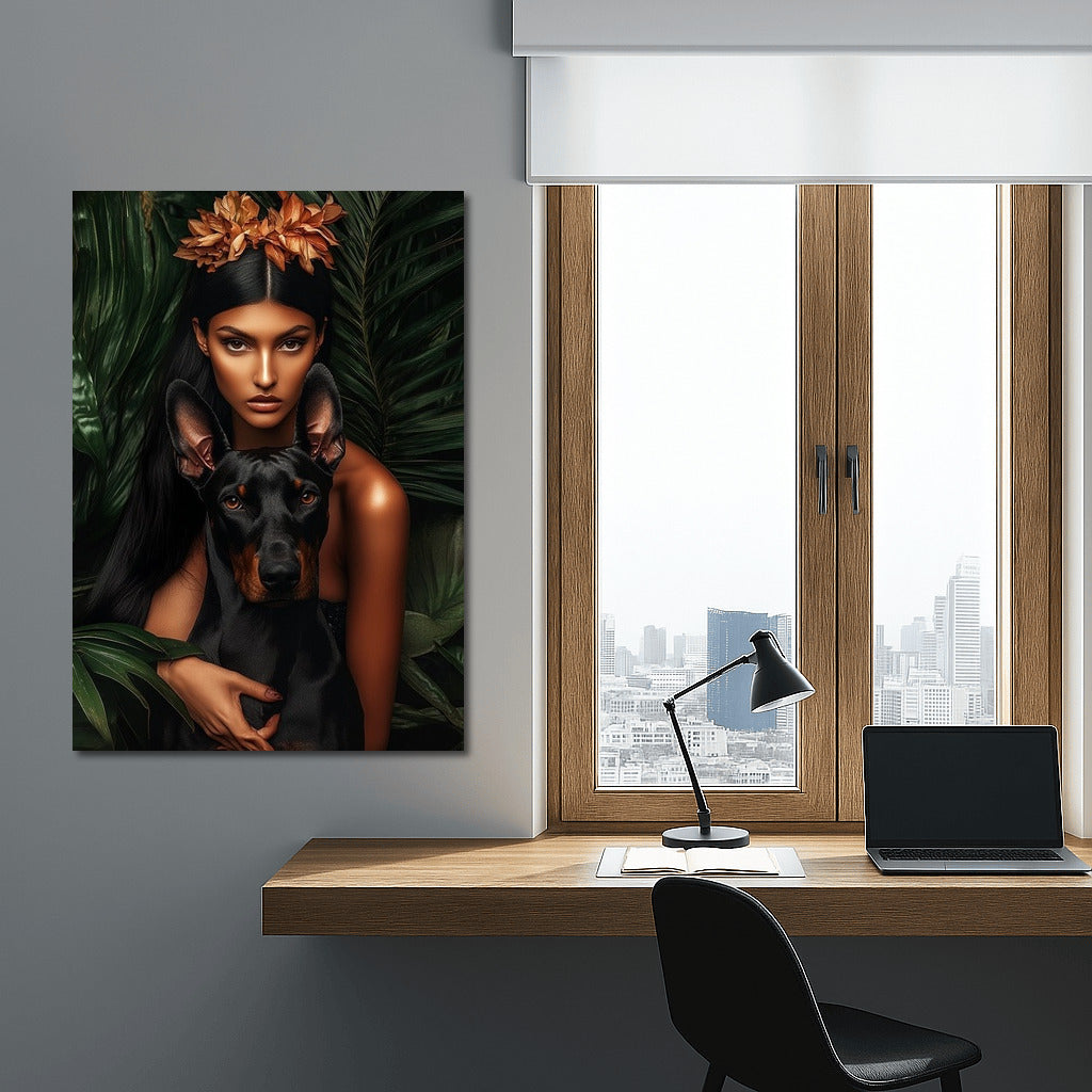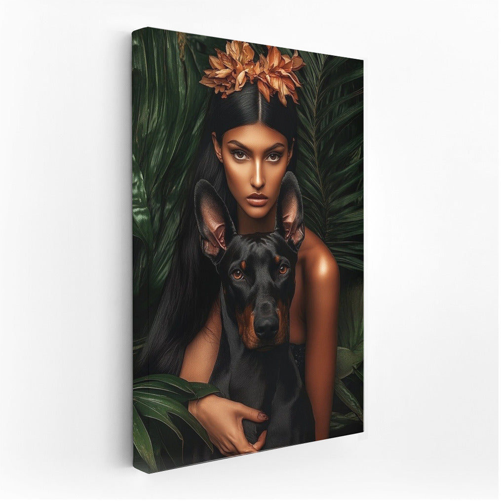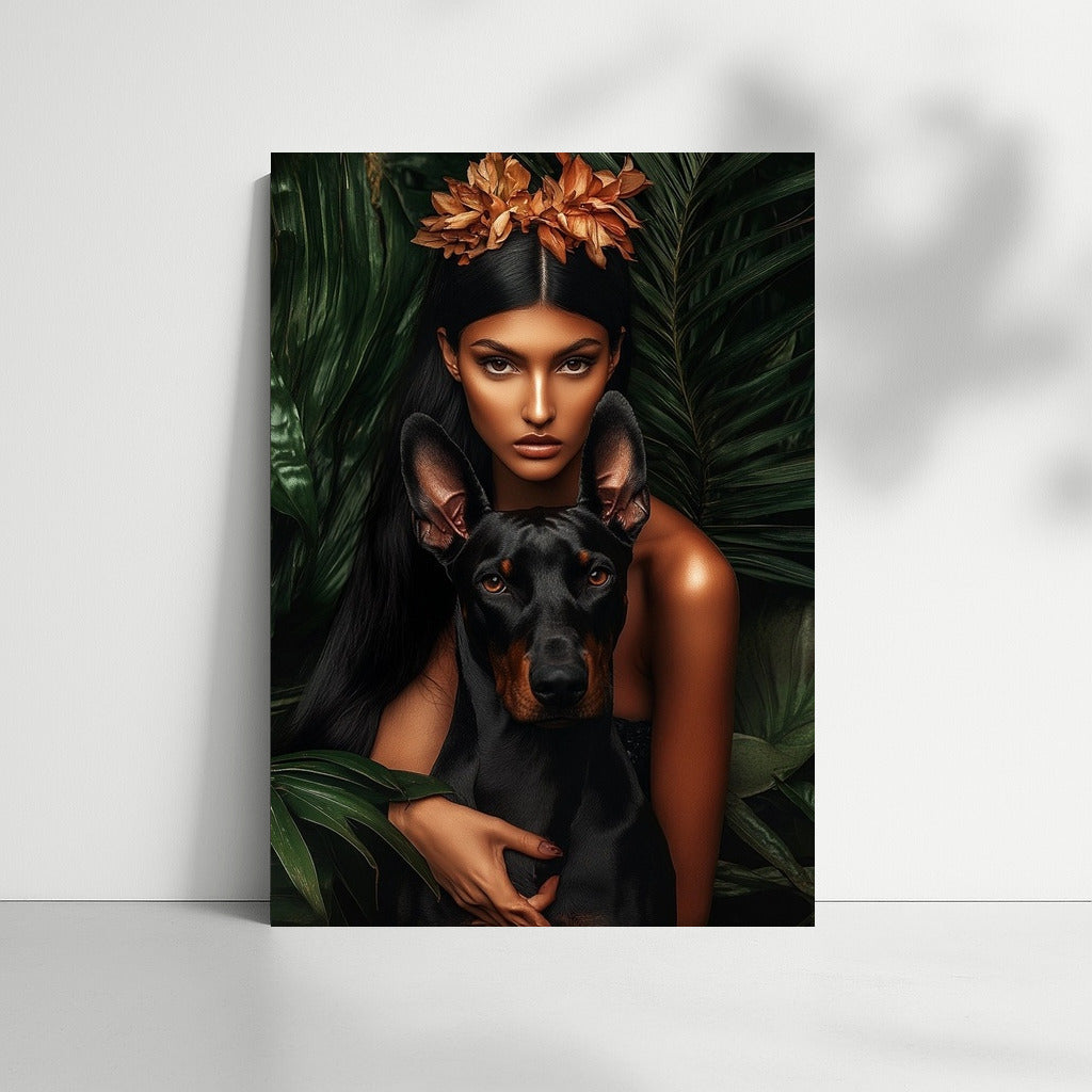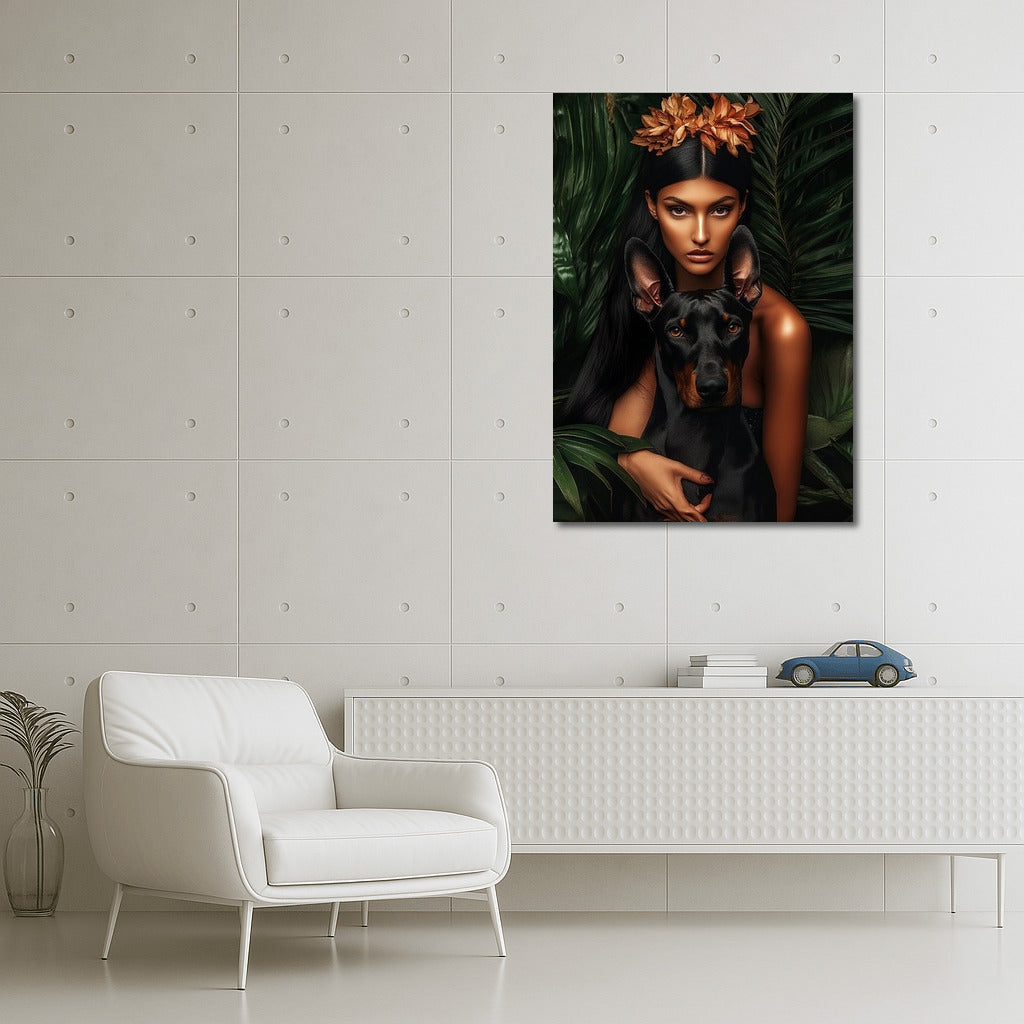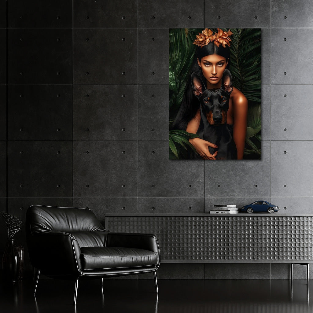 The mysterious harmony of nature and power: a poster where art connects man and dog in a green jungle. See more from the collection: Wall Art with Women