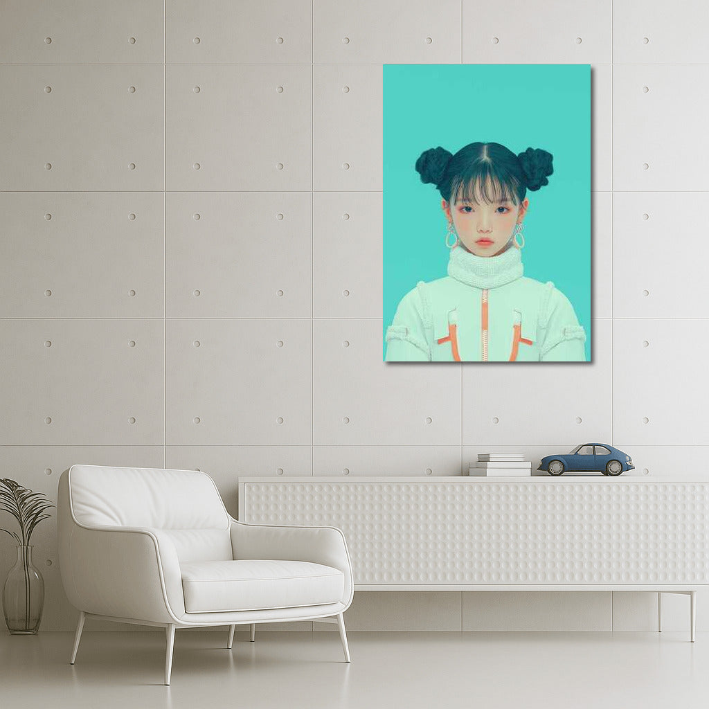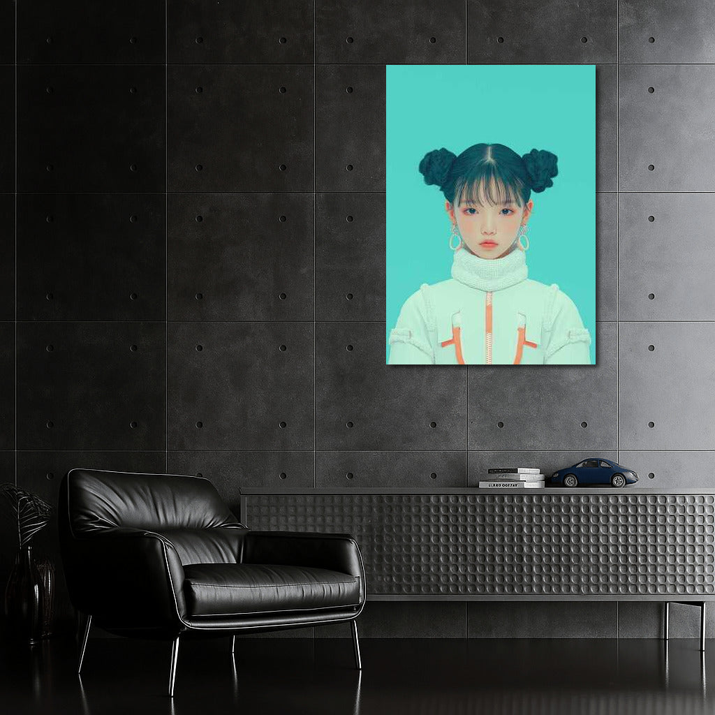 A vibrant poster with elements of K Pop and Korean culture. A neutral figure in the background creates an atmosphere of style and energy. See more from the collection: K-pop & Korean culture Art