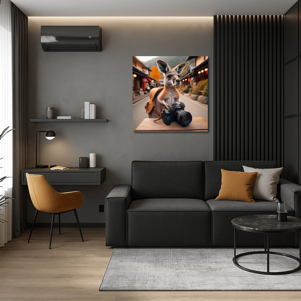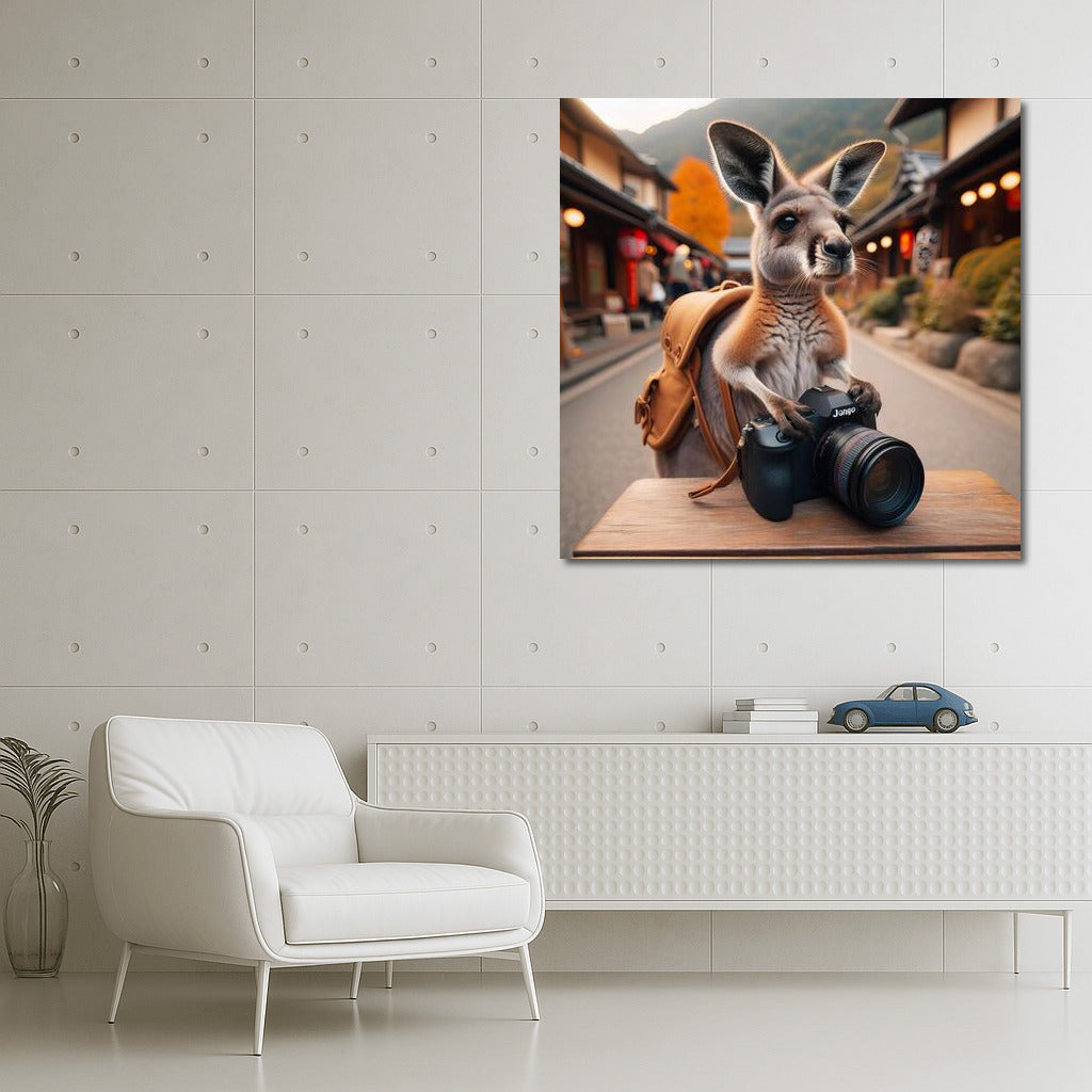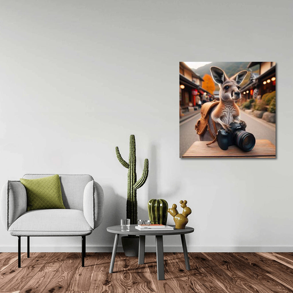 Poster: Kangaroo explores Japan with a camera, capturing moments! Discover amazing travel wall art. See more from the collection: Kangaroo Art