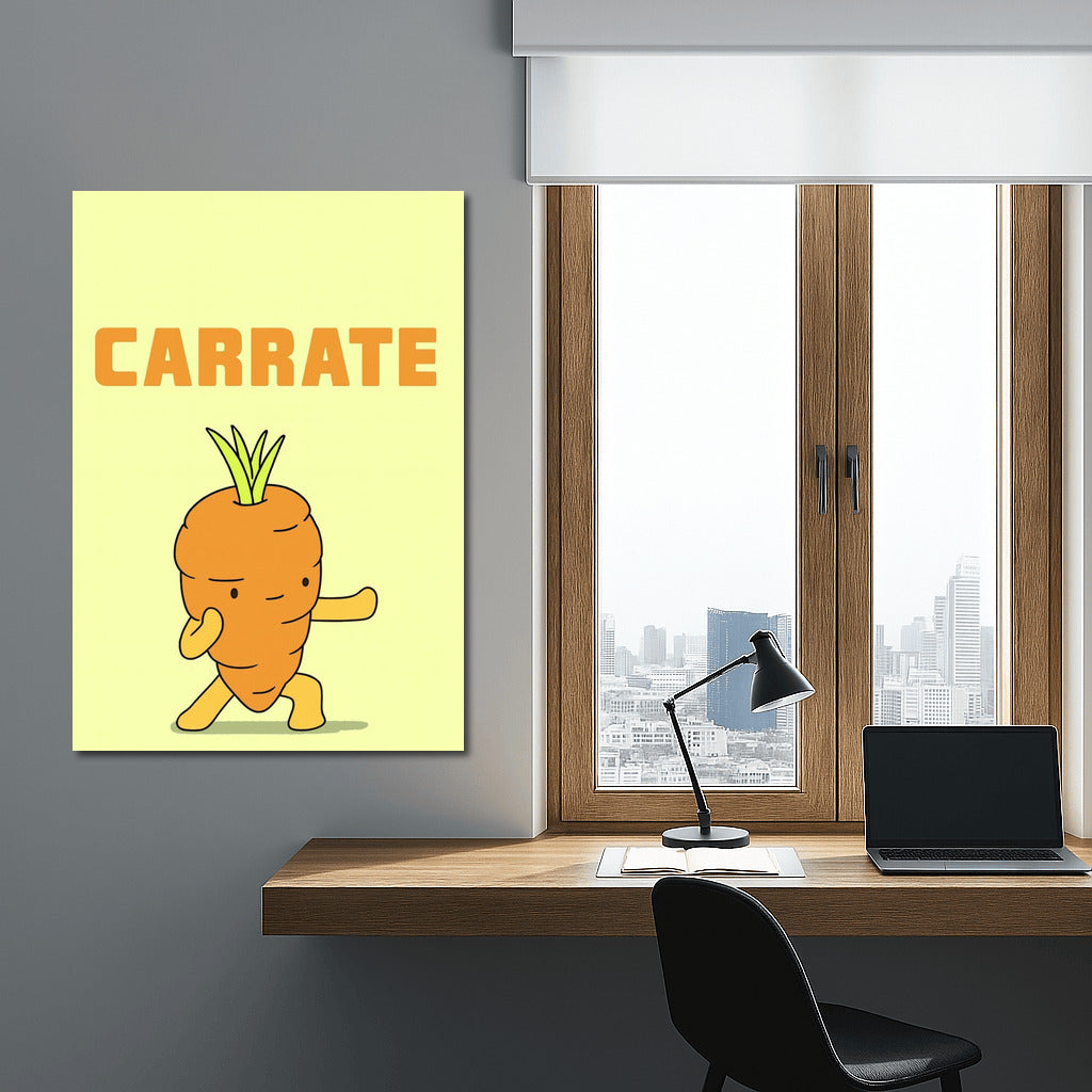 Bright painting with a funny karate carrot. Wall art in support of Vegan Animal Rights with a smile. See more from the collection: Vegan / Animal rights Art