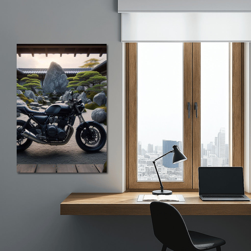 Dynamic and calm: Kawasaki poster in a Japanese garden. Wall art for motorcycle and meditation lovers. See more from the collection: Kawasaki Motorcycle Art