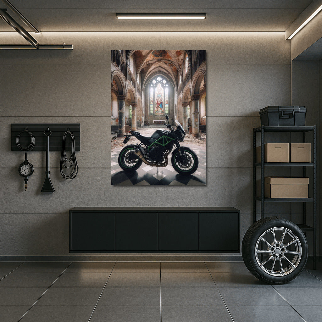 The power of a Kawasaki motorcycle in an abandoned church. This poster will be a bold accent to your wall art! See more from the collection: Kawasaki Motorcycle Art