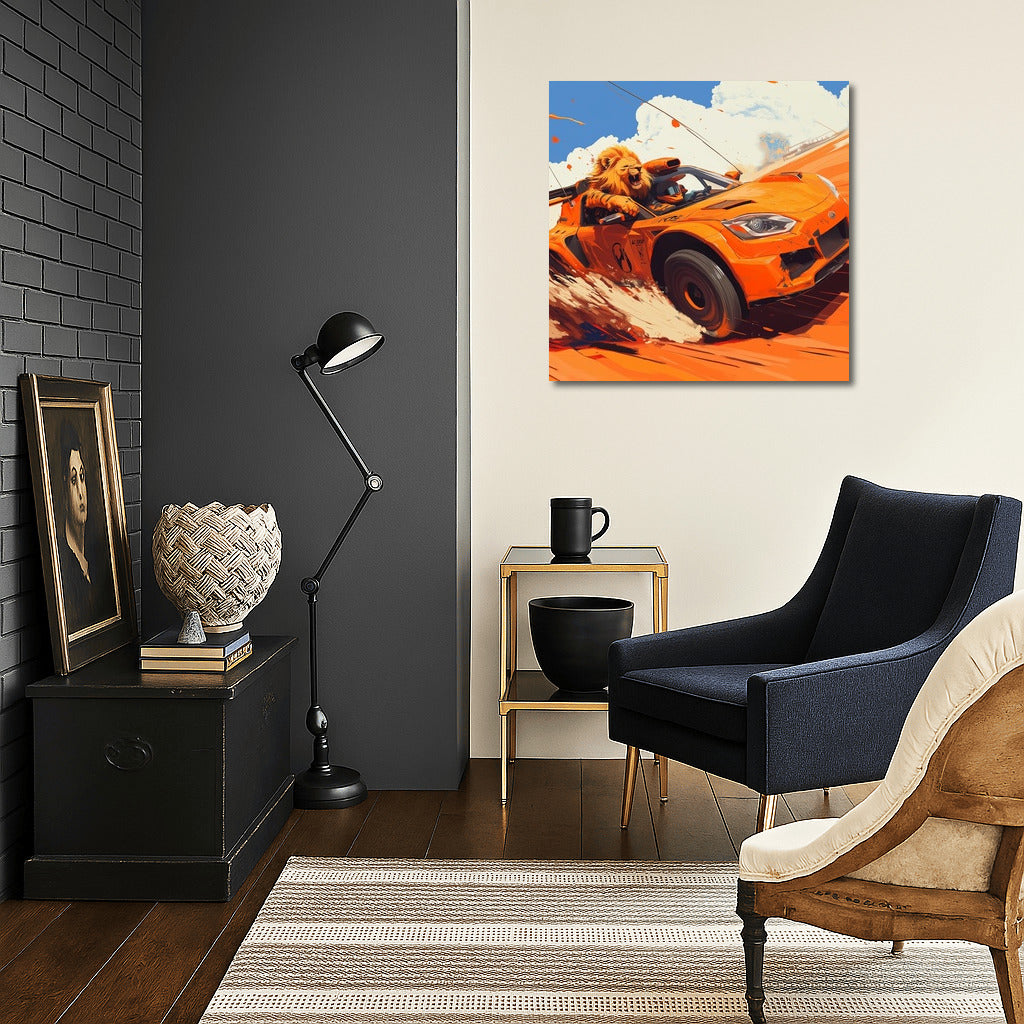 Hurricane of speed! A bright poster with a lion driving an orange sports car. Wall art for true adrenaline lovers! See more from the collection: Mixed Wall Art