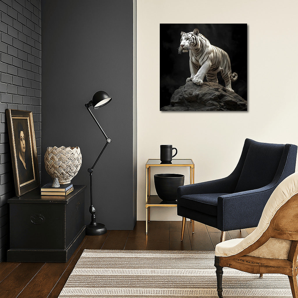 White tiger on top of a cliff is the embodiment of strength and grace. A perfect poster to create a wild nature atmosphere in your home. See more from the collection: Animals Art