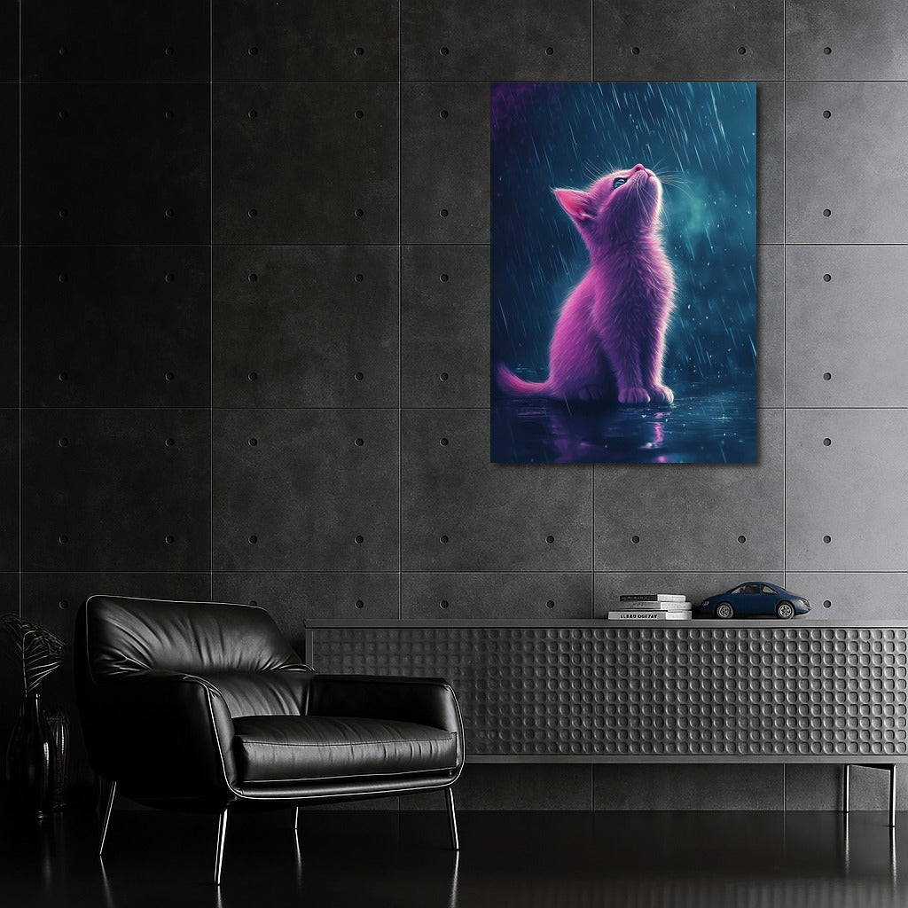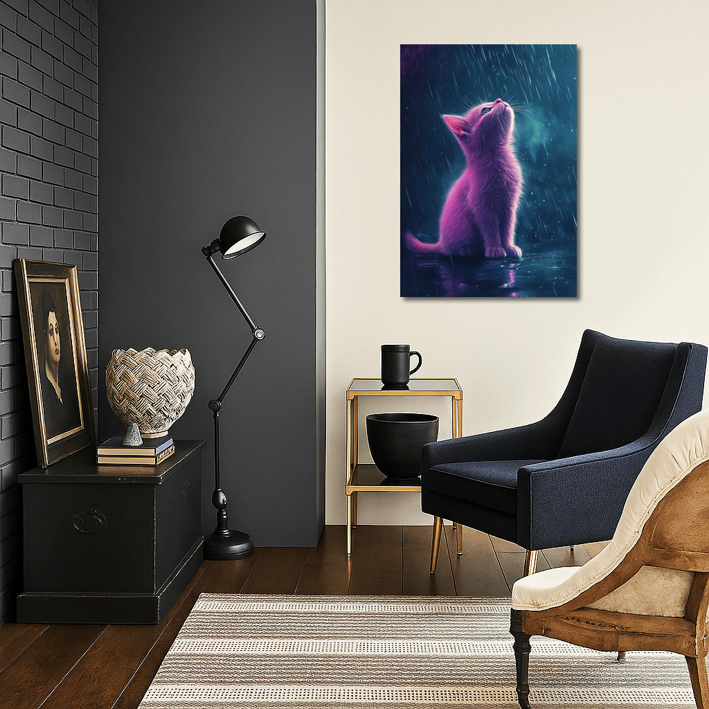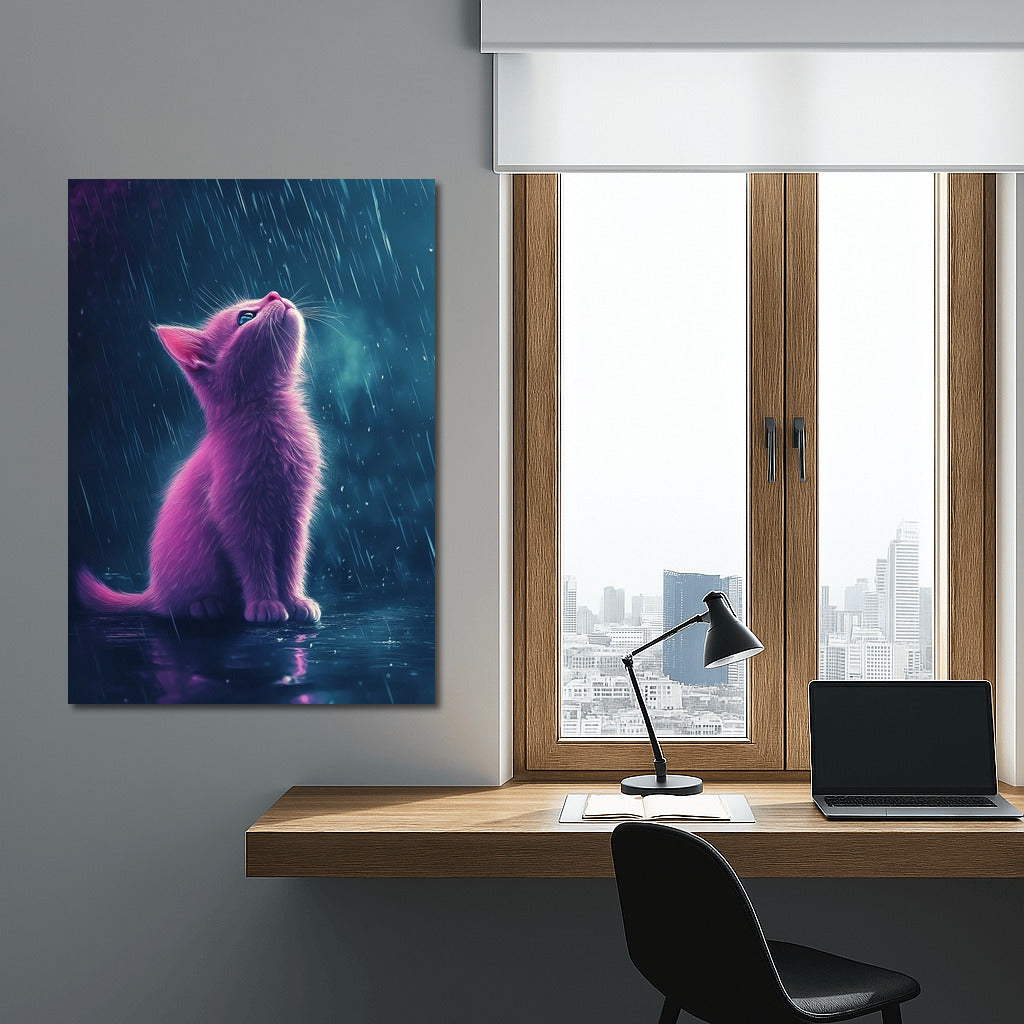 Playful painting of a kitten looking up in the rain. The bright palette and tenderness of the moment make for perfect wall art. See more from the collection: Animals Art