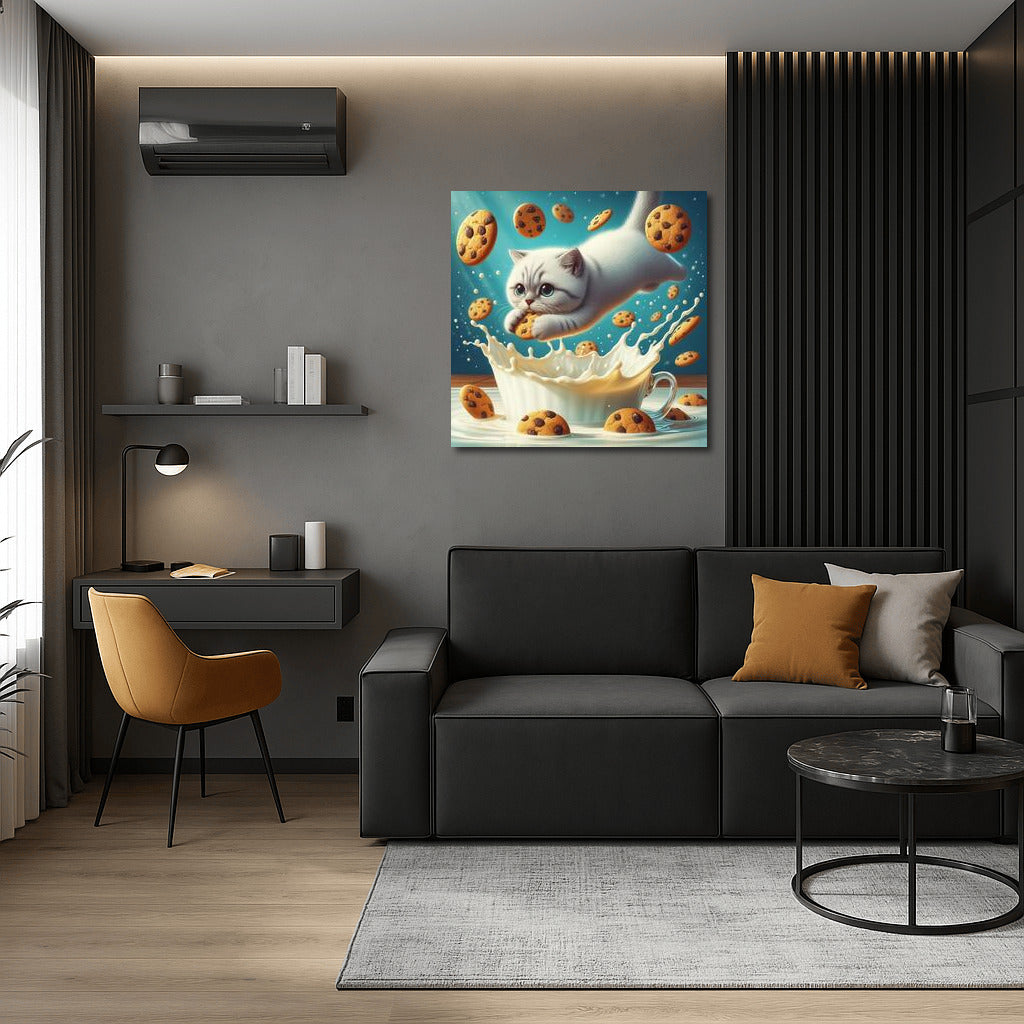 Fluffy cat dives into a sea of milk, surrounded by flying cookies! The perfect poster for those who love sweet dreams. See more from the collection: Animals Art