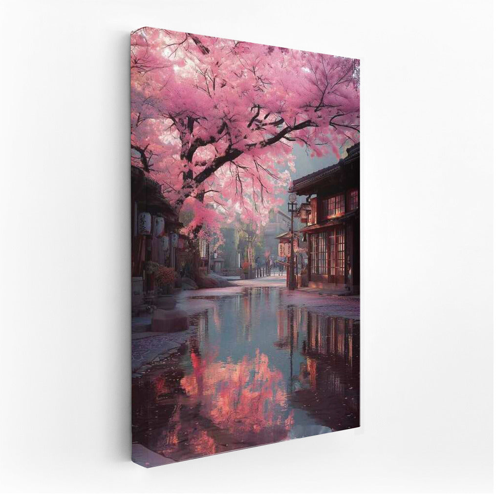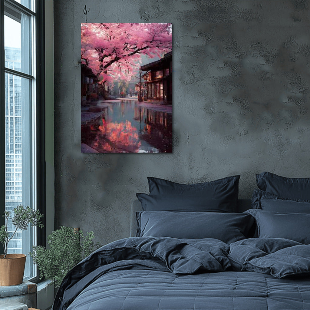 Kyoto's Spring Fairytale: A poster of cherry blossoms and reflections of ancient buildings, art that brings walls to life. See more from the collection: Cityscapes & Skylines Art