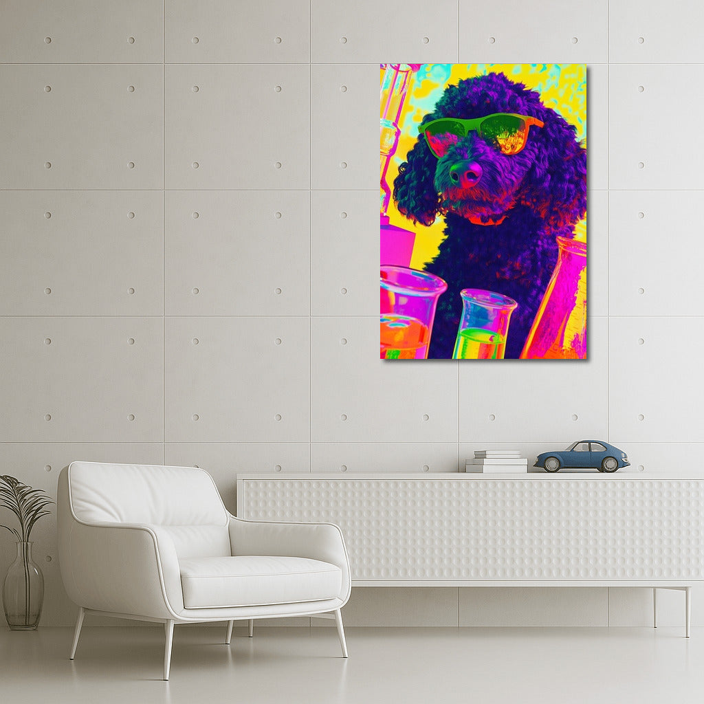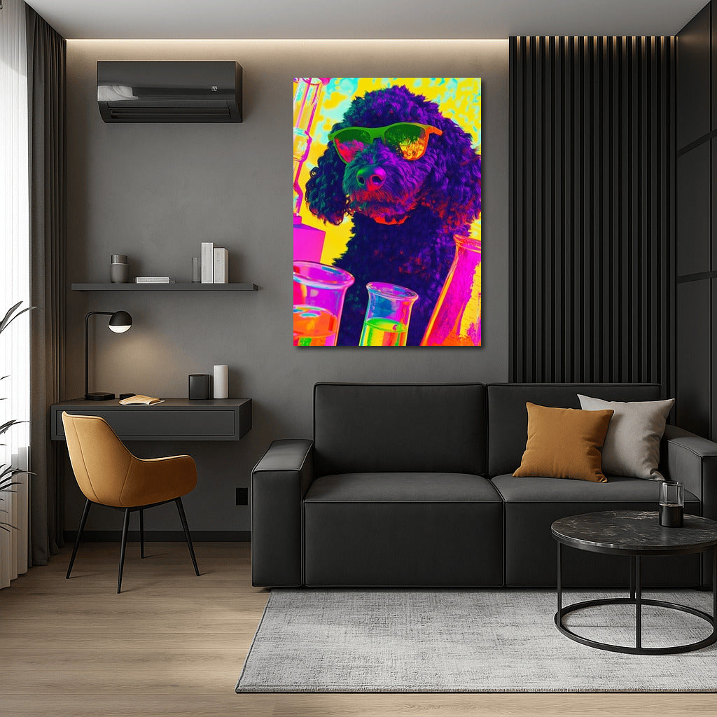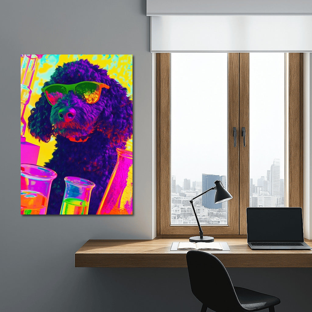 Add a bright accent to your interior with a poster of a stylish dog in glasses conducting his scientific experiments. Wall inspiration! See more from the collection: Animals Art