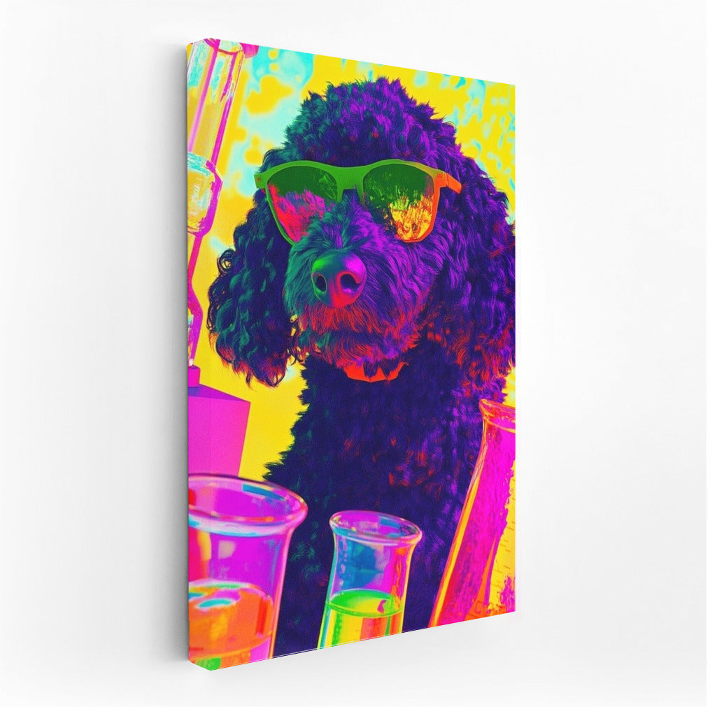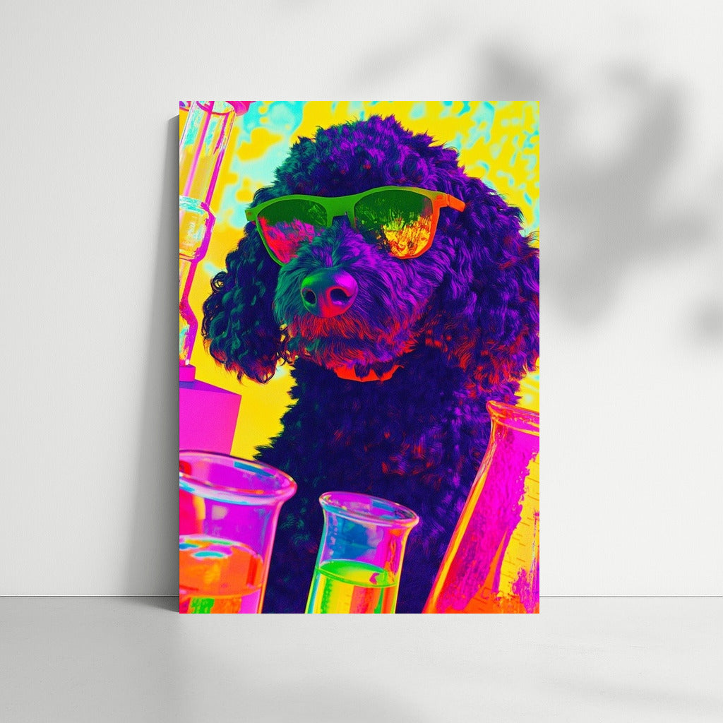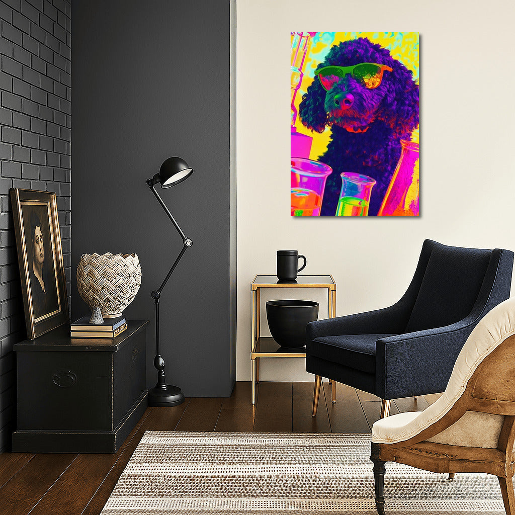 Add a bright accent to your interior with a poster of a stylish dog in glasses conducting his scientific experiments. Wall inspiration! See more from the collection: Animals Art