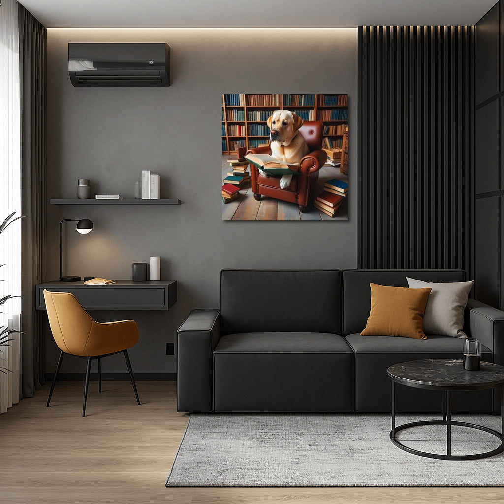 Adorable poster of a labrador in a library on a small chair, immersed in a book. Perfect wall art for book lovers! See more from the collection: Animals Art