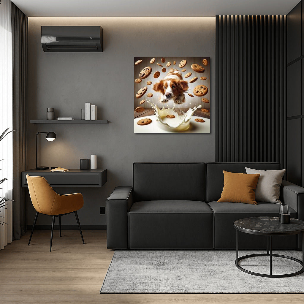 A dog diving into milk amidst steaming cookies. This poster will add a playful charm to your wall art! See more from the collection: Animals Art