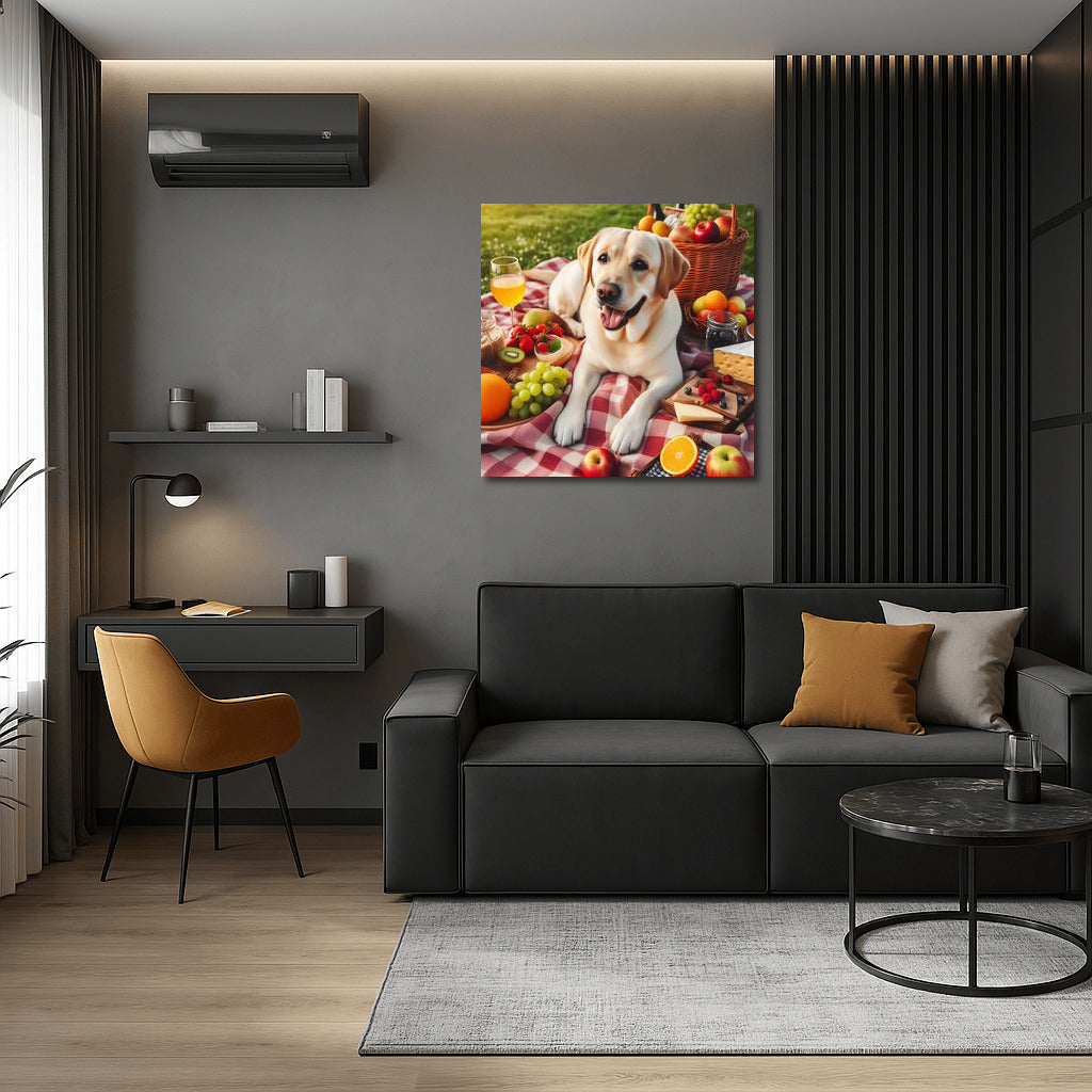 Labrador on a picnic: art poster with savory fruits and cheese on a plaid blanket. Wall charm for your home! See more from the collection: Animals Art