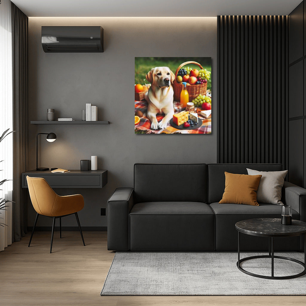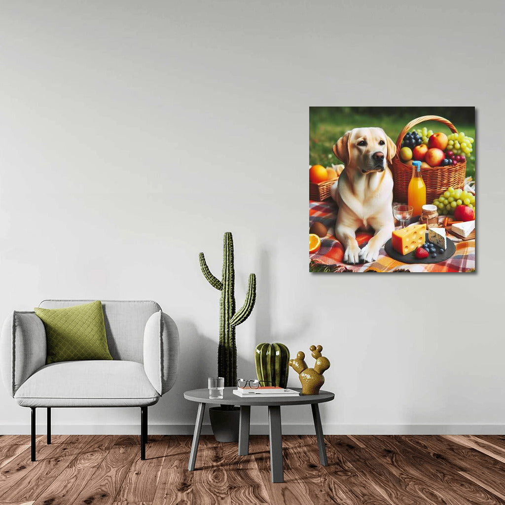 Labrador on a picnic: wall art with the coziness of nature. Pastel colors, fruits and cheese create an atmosphere of coziness and joy. See more from the collection: Animals Art
