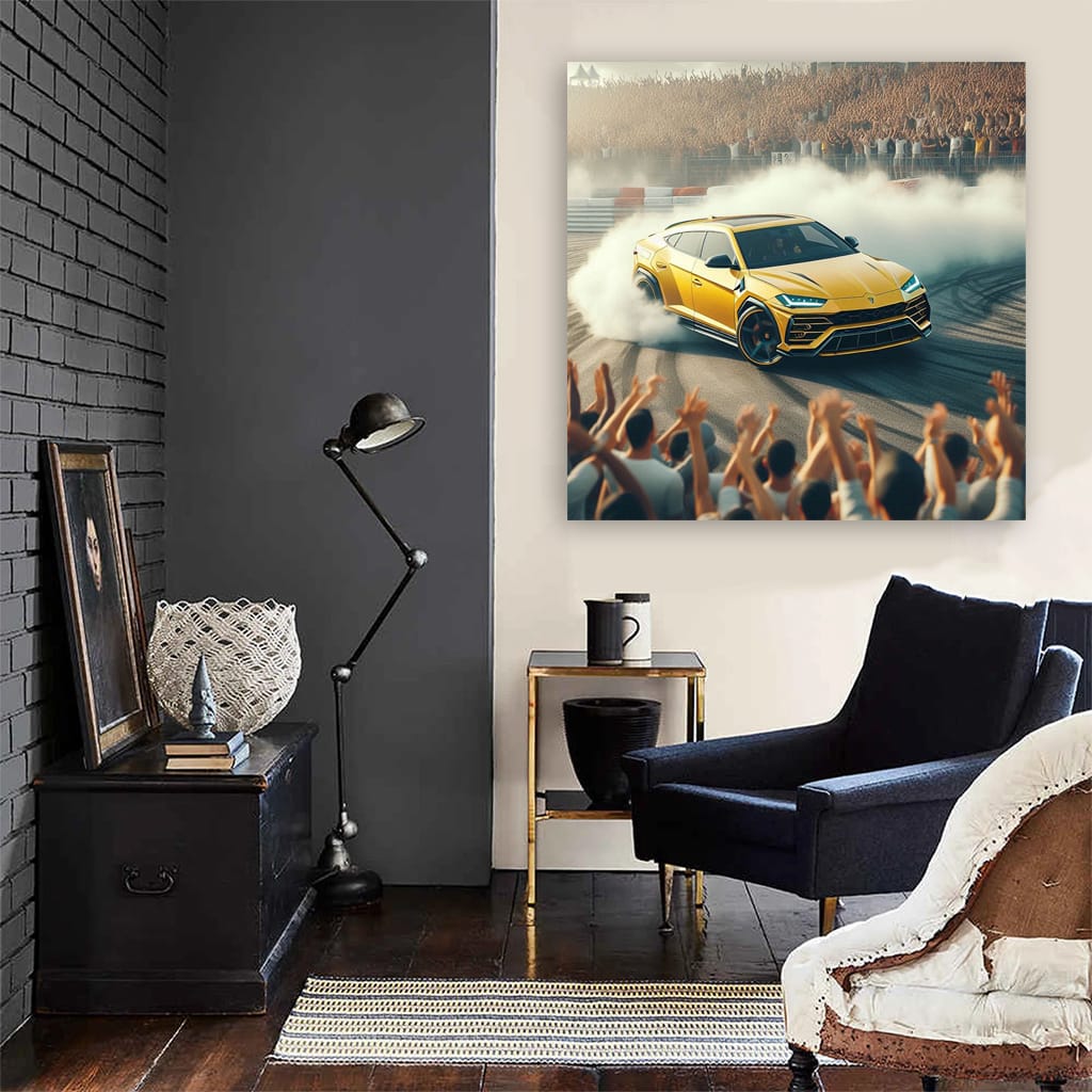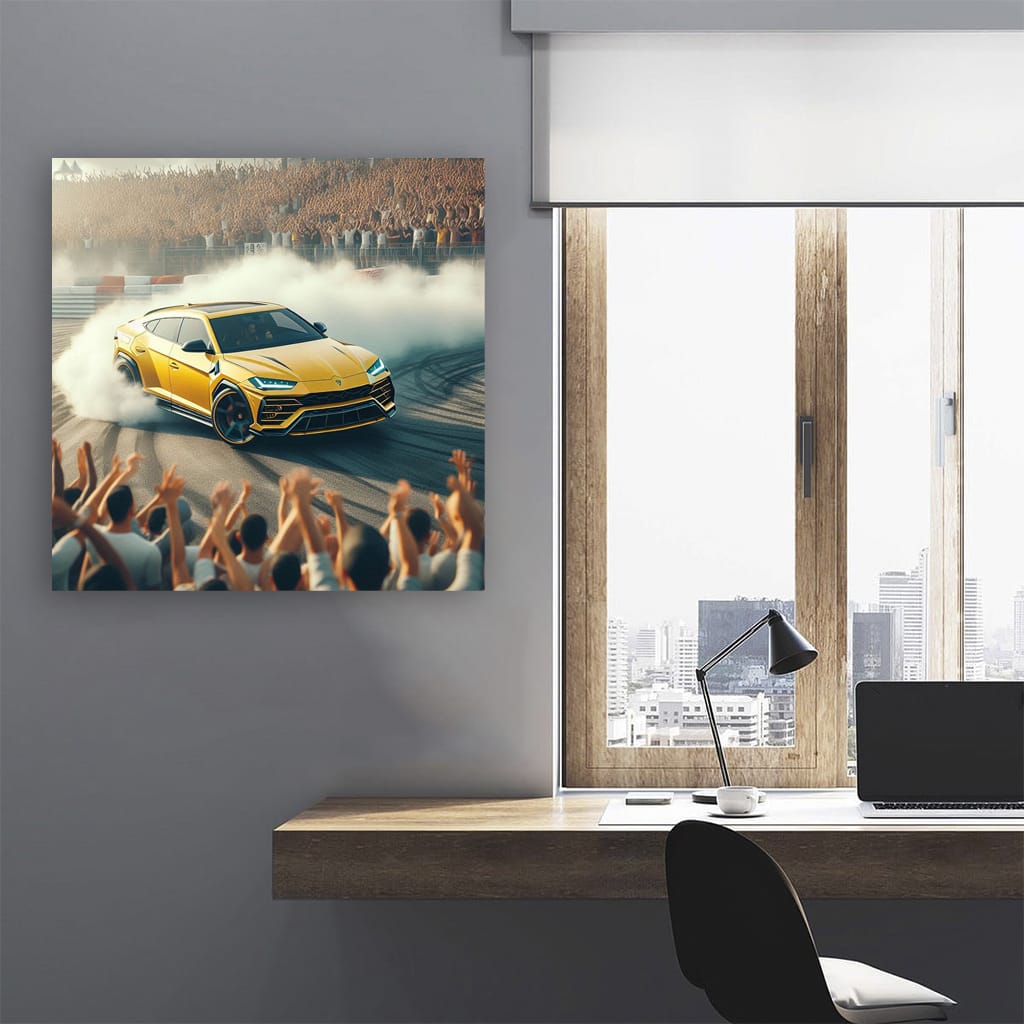 There's a poster of a Lambo Urus hanging on the wall, and it's not just a poster, it's a true masterpiece of wall art. It's a painting of a drifting Urus, like a beast tearing up the asphalt. Pure power and adrenaline, frozen on canvas. See more from the collection: Lamborghini Art
