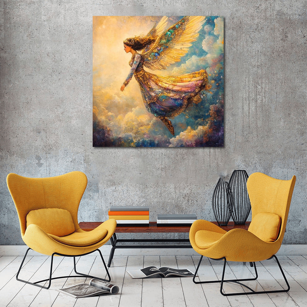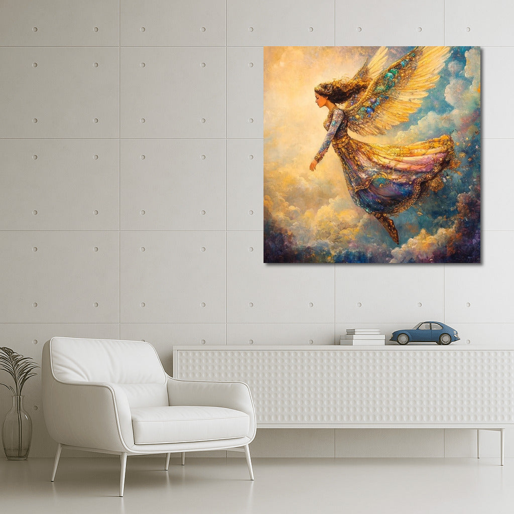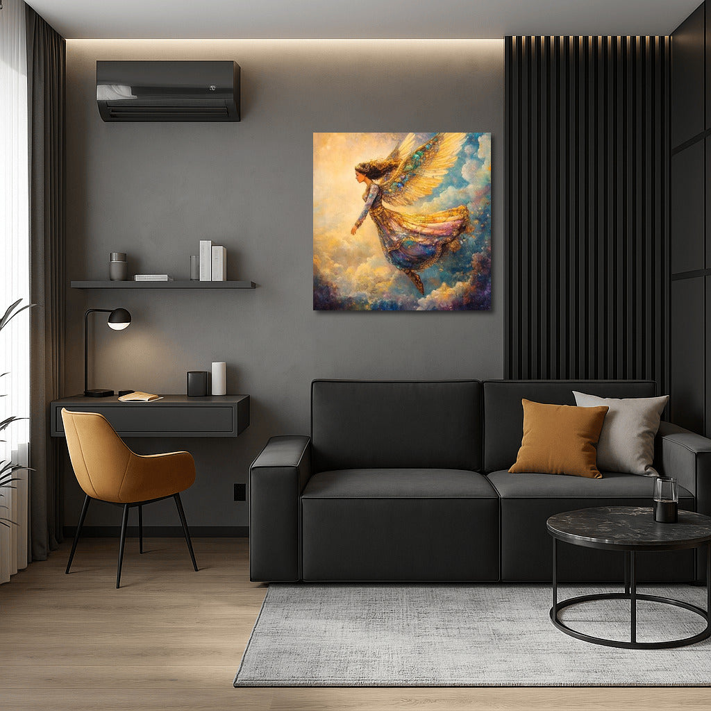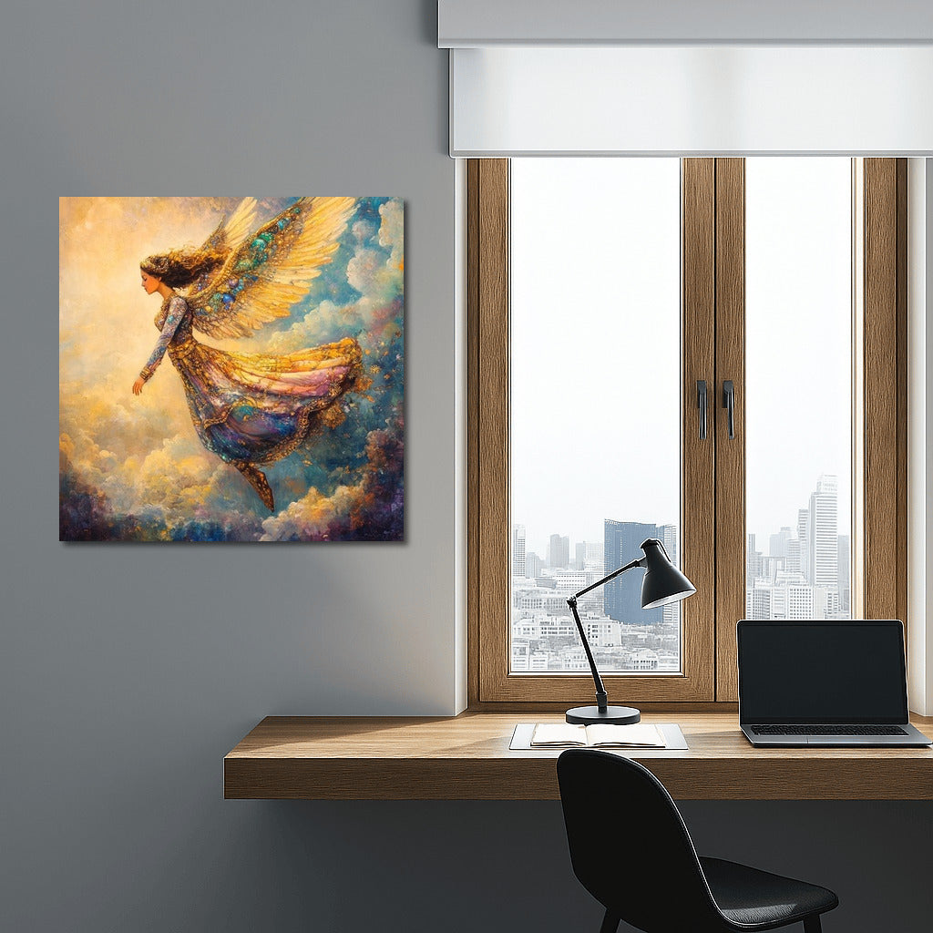 A figure soaring through the clouds in a glittering gown and golden wings. Add some magic to your space with this mesmerizing wall art. See more from the collection: Mixed Wall Art