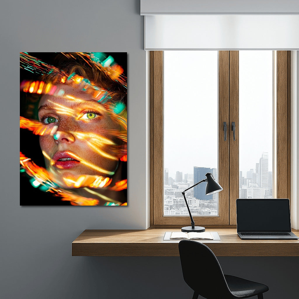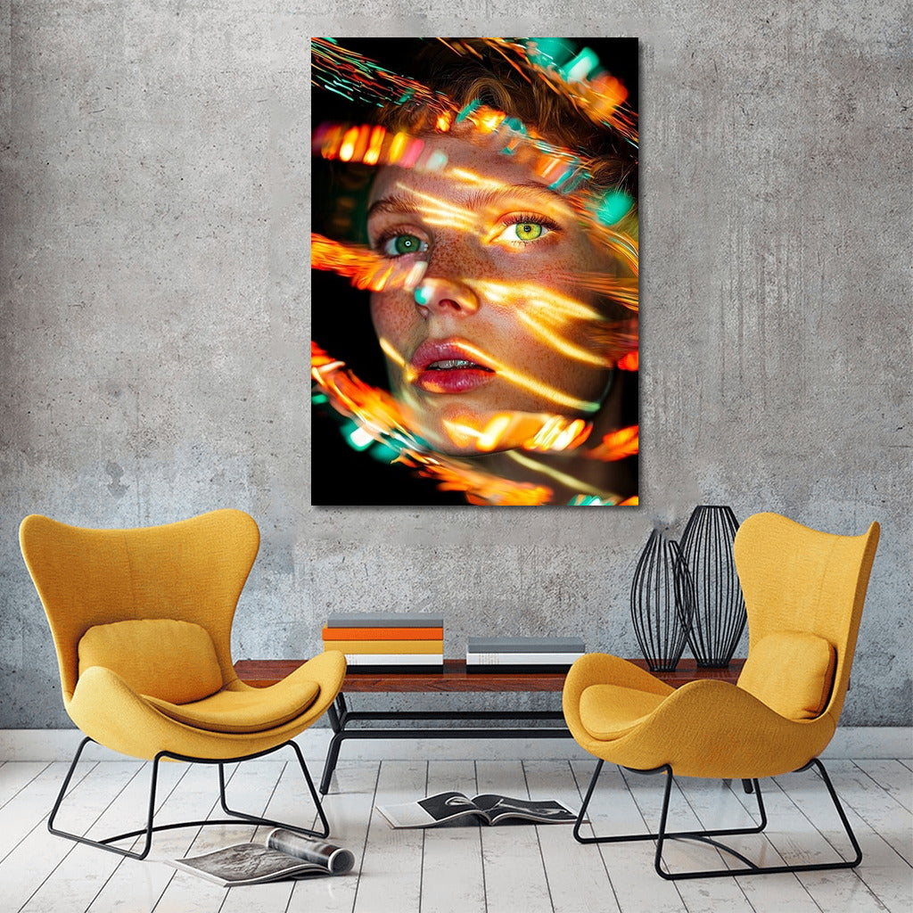 A striking painting of a girl's face through a swirl of lights. This poster will become a living accent in your wall art! See more from the collection: Mixed Wall Art