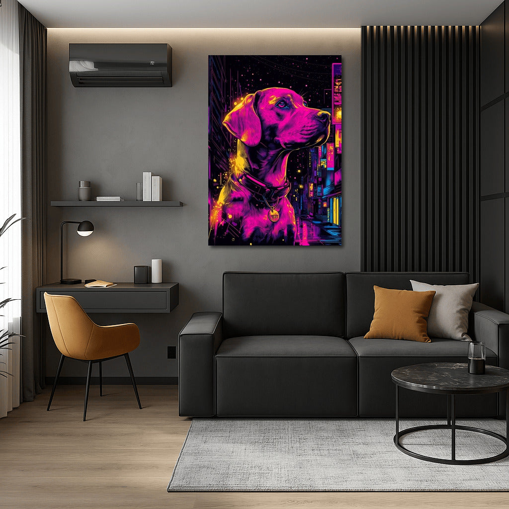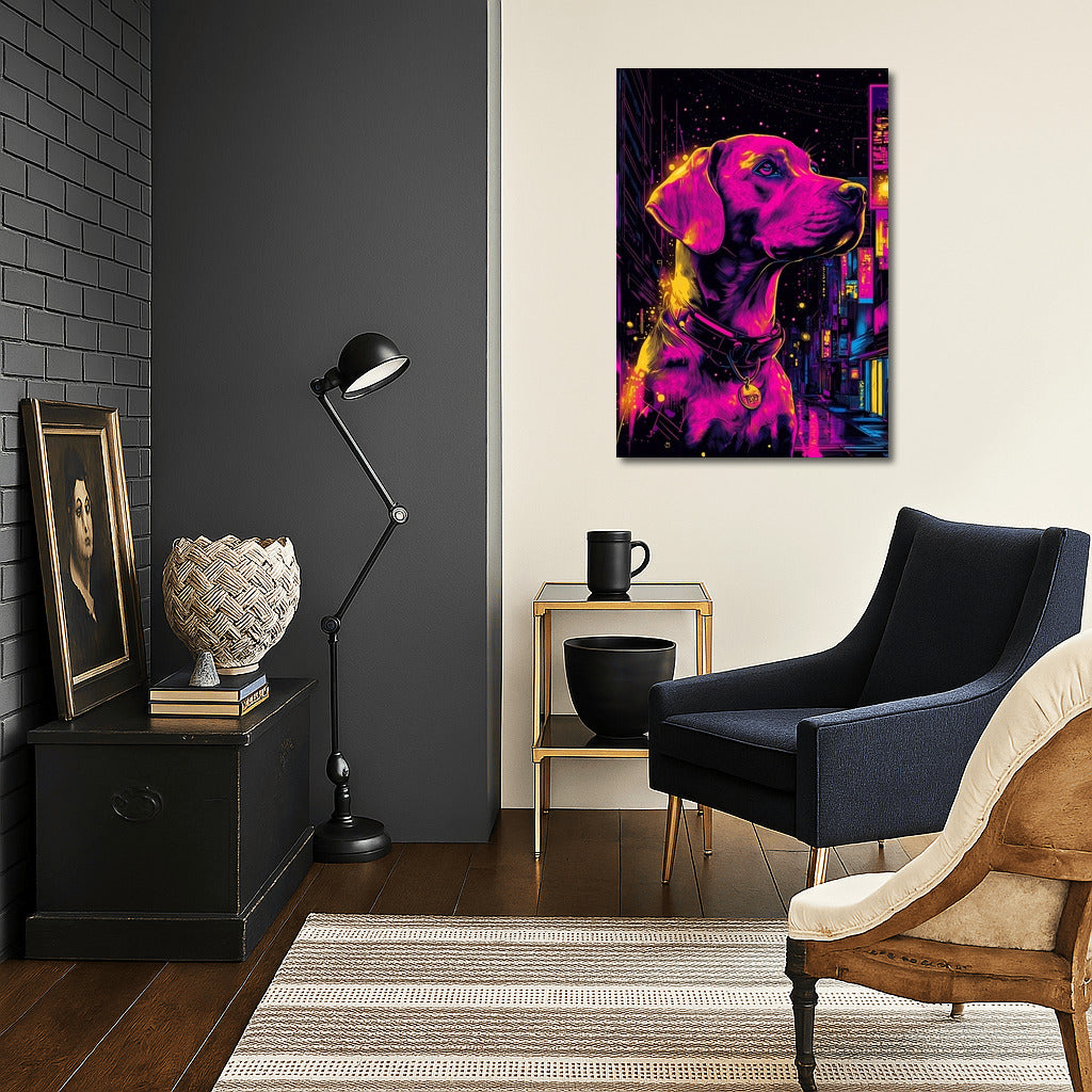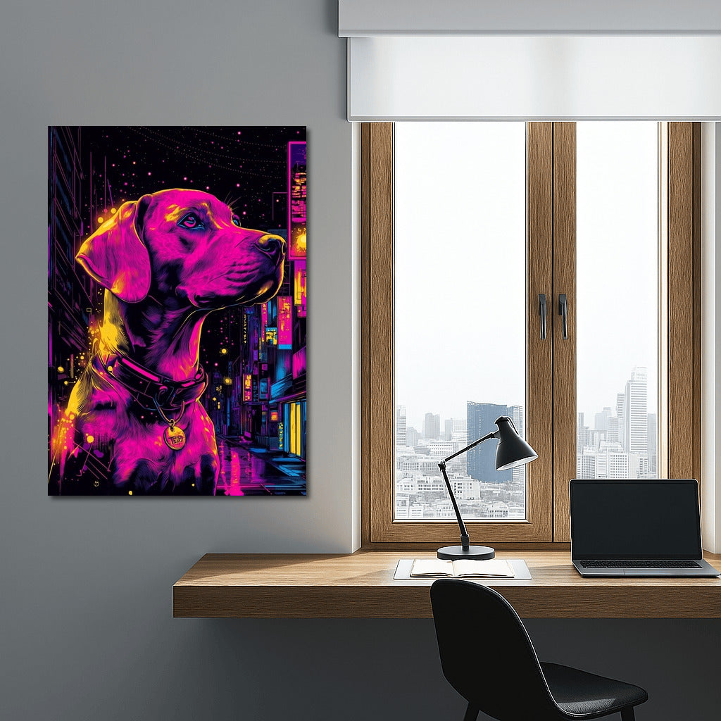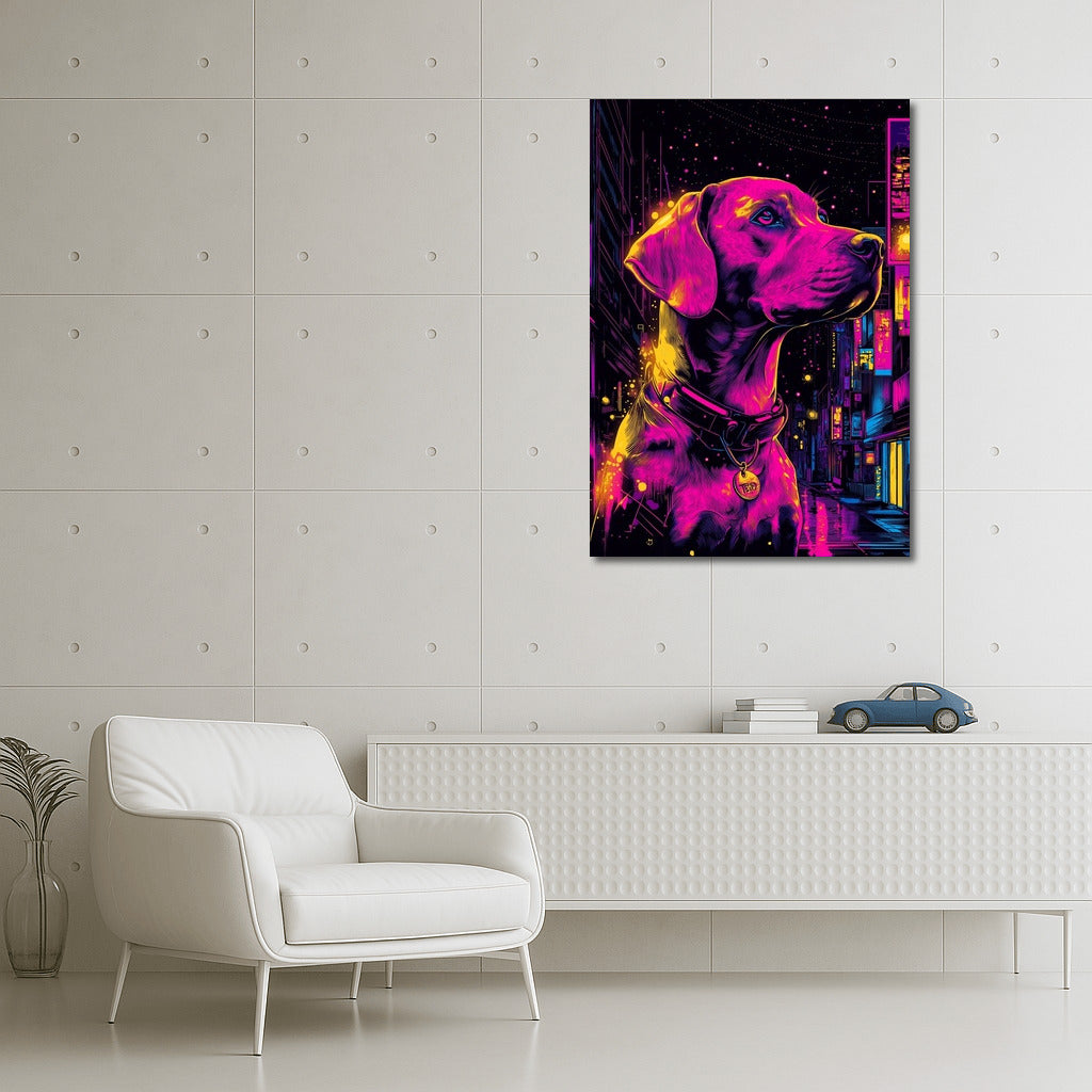 Neon Magic: The poster depicts a dog in the bright colors of a night city. Wall art that brings life to any space. See more from the collection: Animals Art