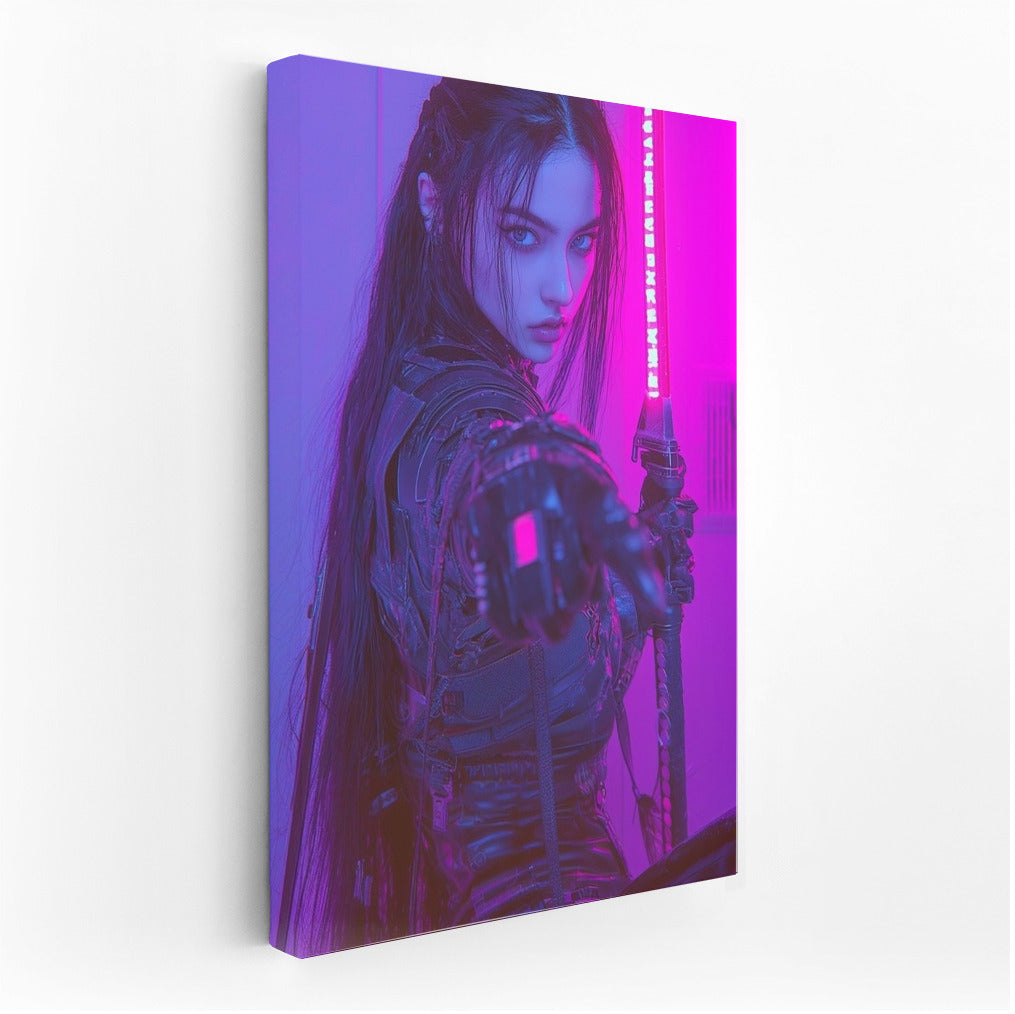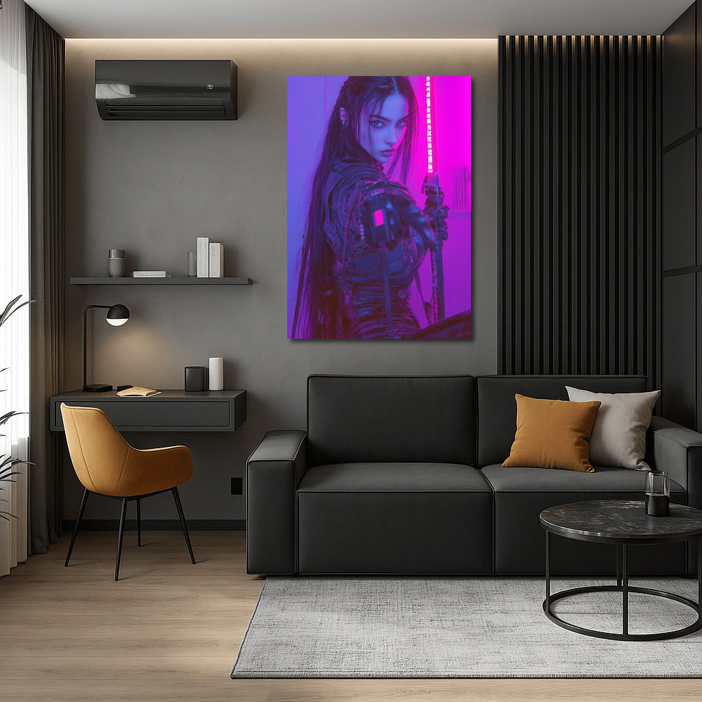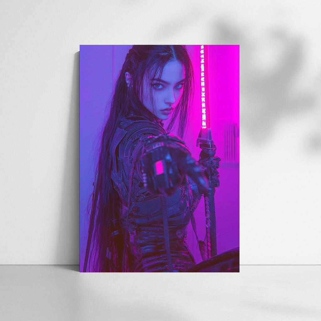 Neon Fantasy: A mysterious figure in a futuristic style with a sword. The embodiment of style for your wall art! See more from the collection: Wall Art with Women