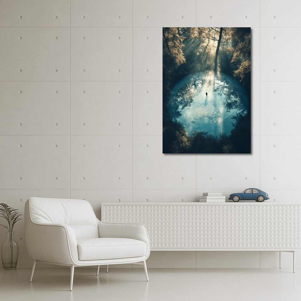 Magical poster: a mysterious figure in the middle of a forest lake, shrouded in light. Wall art for dreamers and seekers of miracles. See more from the collection: Lakes & Rivers Art