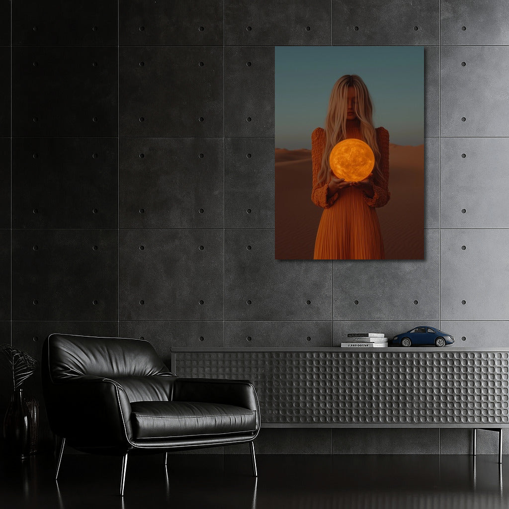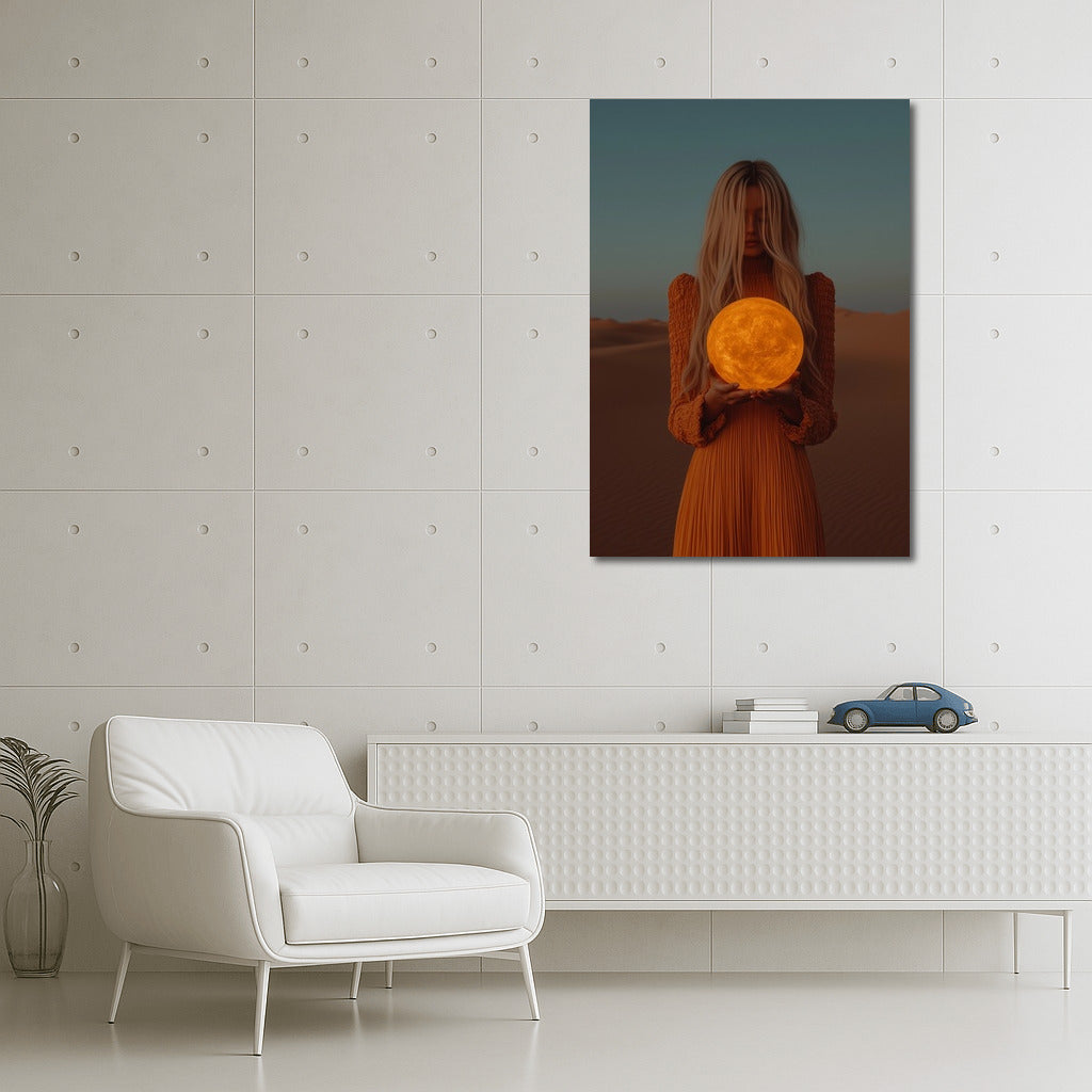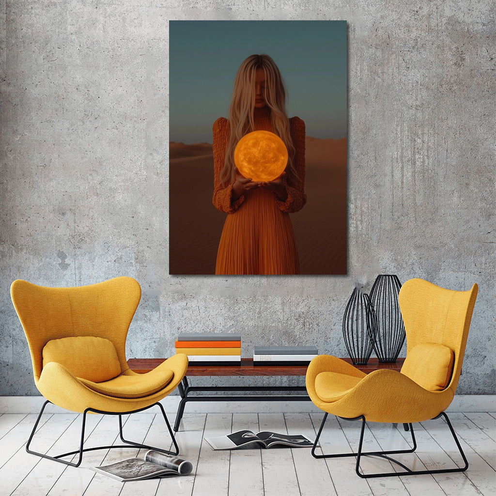 A mysterious girl holding a glowing sun against a desert backdrop. This poster will be the perfect accent to your wall art. See more from the collection: Mixed Wall Art