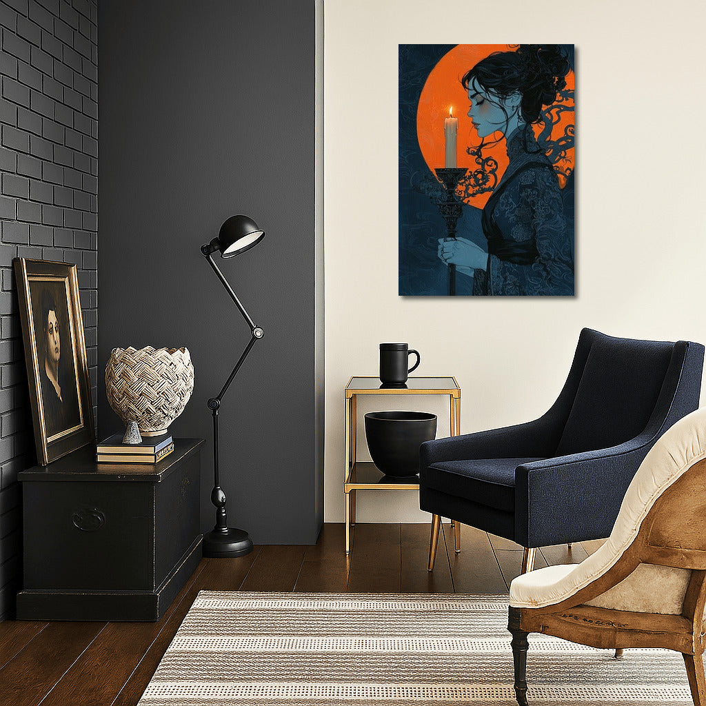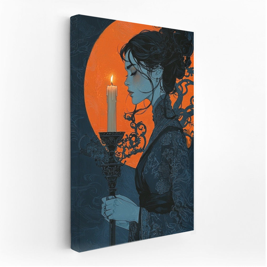 Mystical poster: a mysterious silhouette with a lit candle against the bright moon. Perfect wall art for lovers of magic. See more from the collection: Mixed Wall Art