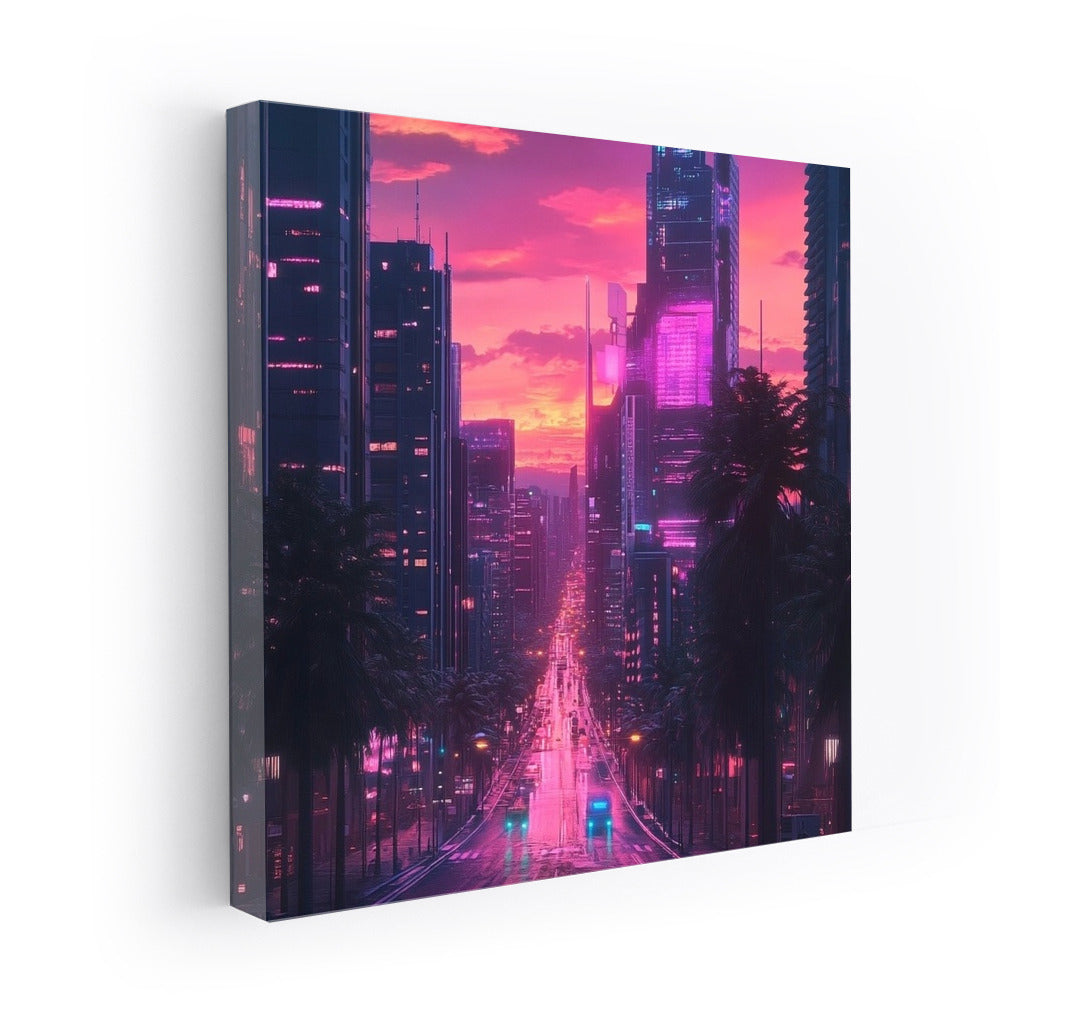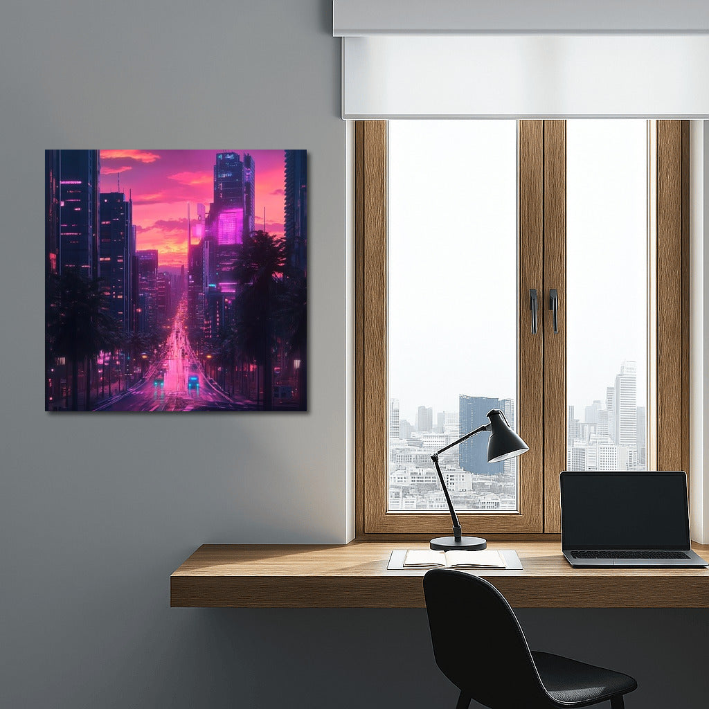 Neon sunset in a cyberpunk city. This mesmerizing poster will add a futuristic atmosphere to your wall art. See more from the collection: Neon Art