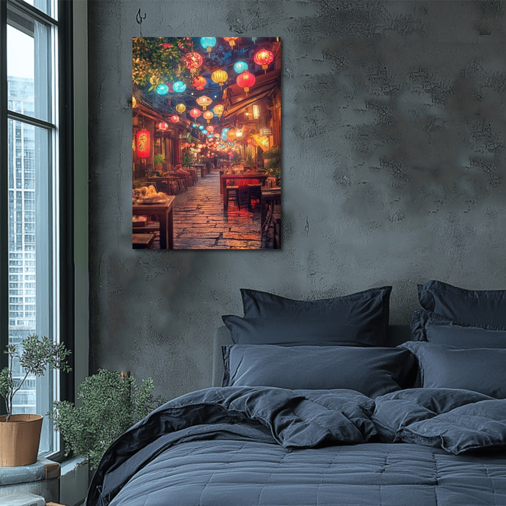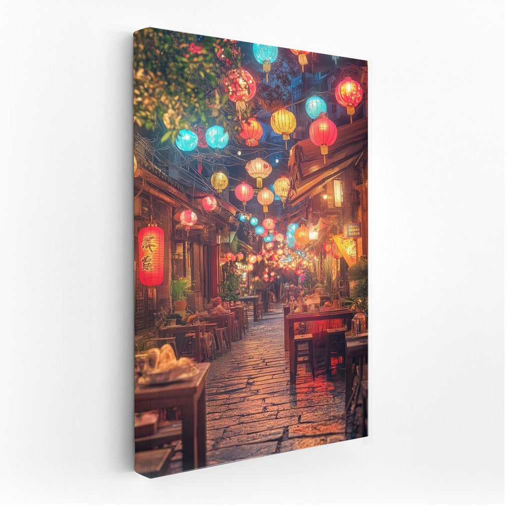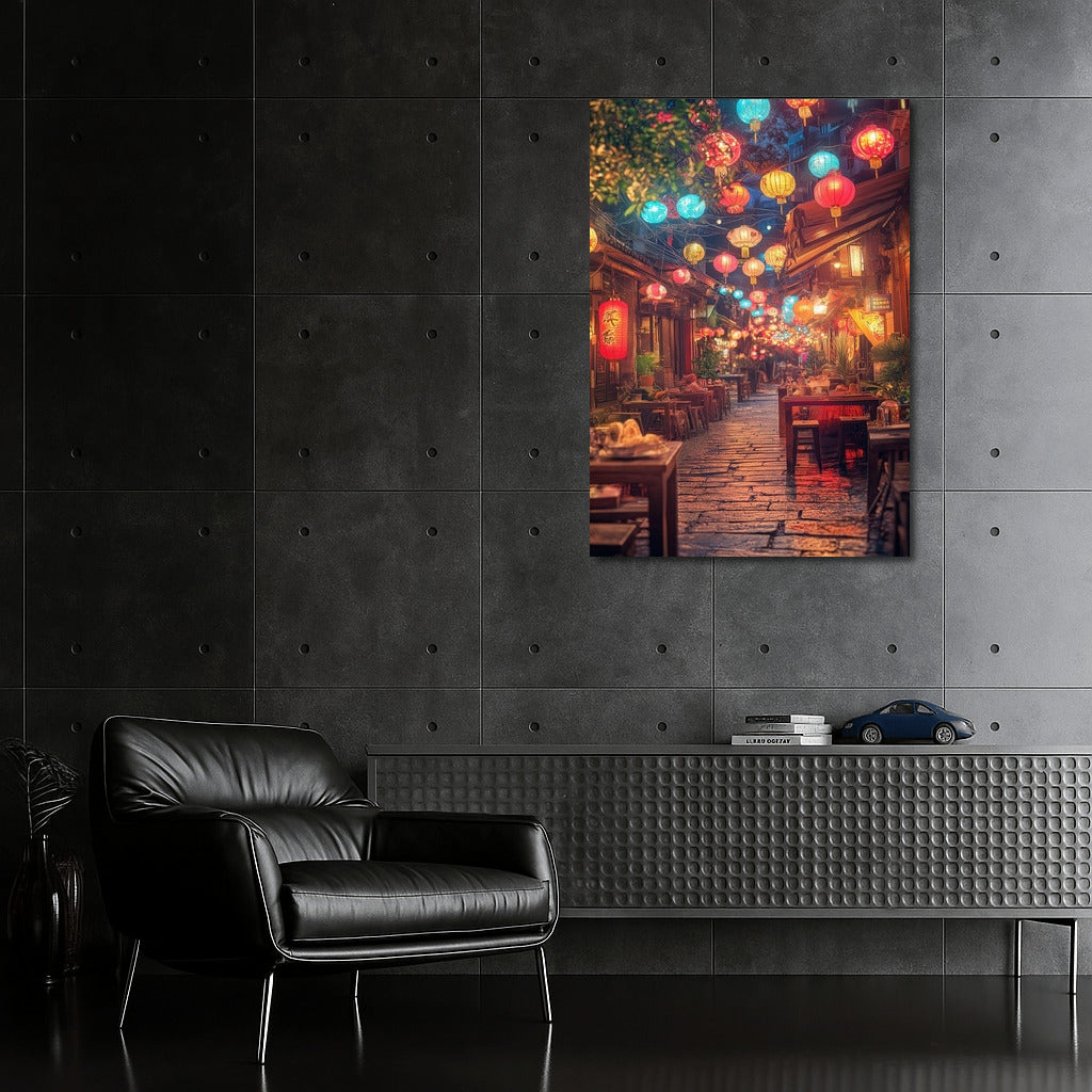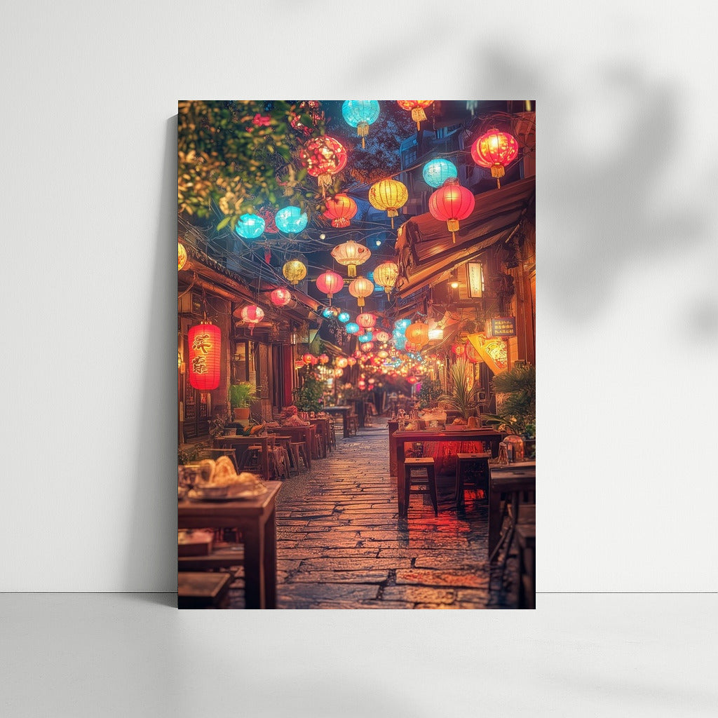 A bright poster with the evening atmosphere of an oriental alley illuminated by many colored lanterns. Wall art full of coziness. See more from the collection: Mixed Wall Art