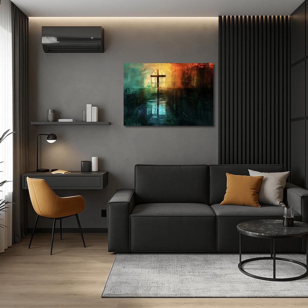 Emotional depth and spirituality in an abstract poster where light shines through stained glass windows, creating a mysterious play of shadows. See more from the collection: Christianity / Jesus Art