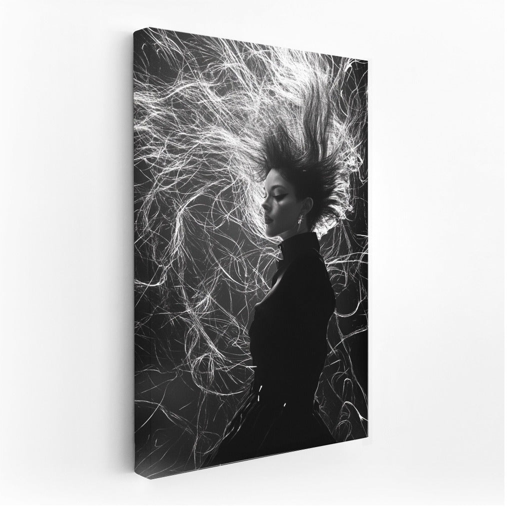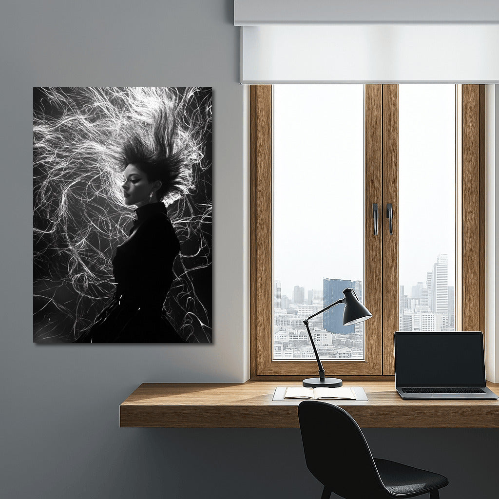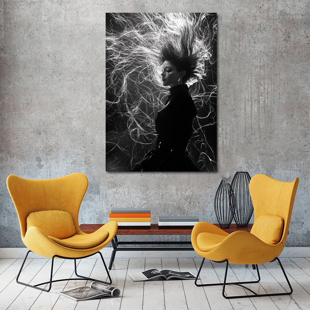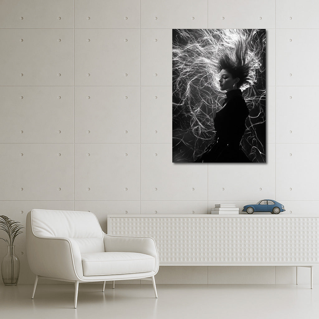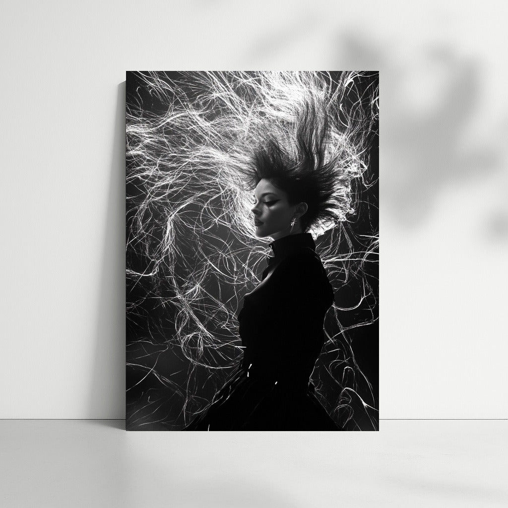 Girl in a Vortex of Light is a captivating art poster that adds dynamics and style to your wall space. See more from the collection: Black and White Art