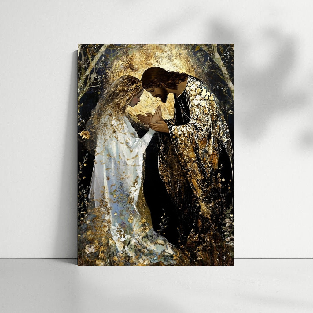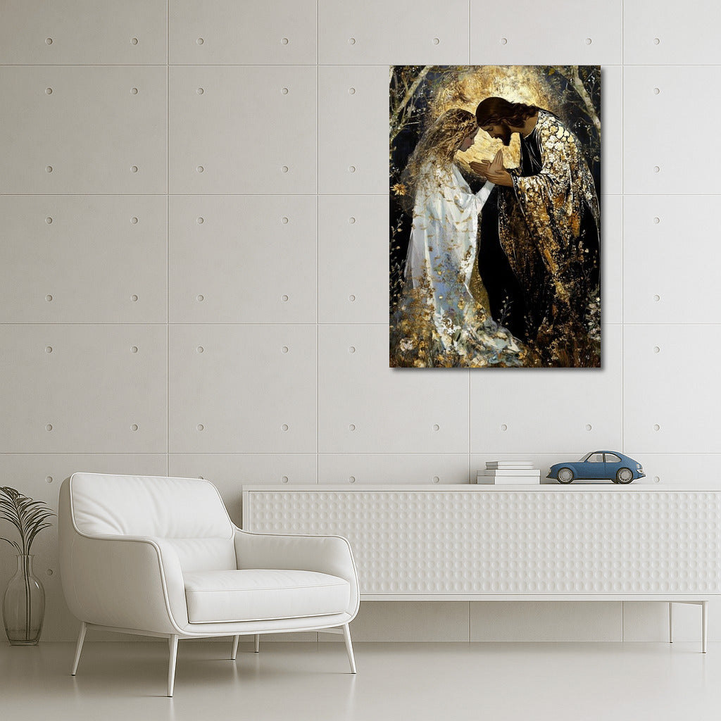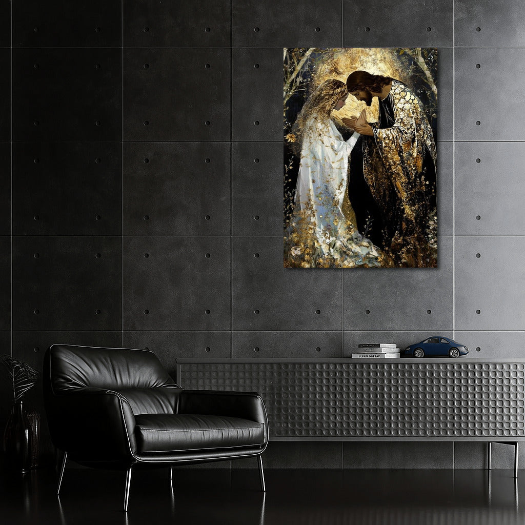 Mystical wall art: two people in the glitter of gold and light. Dive into the world where dreams and reality meet. See more from the collection: Christianity / Jesus Art