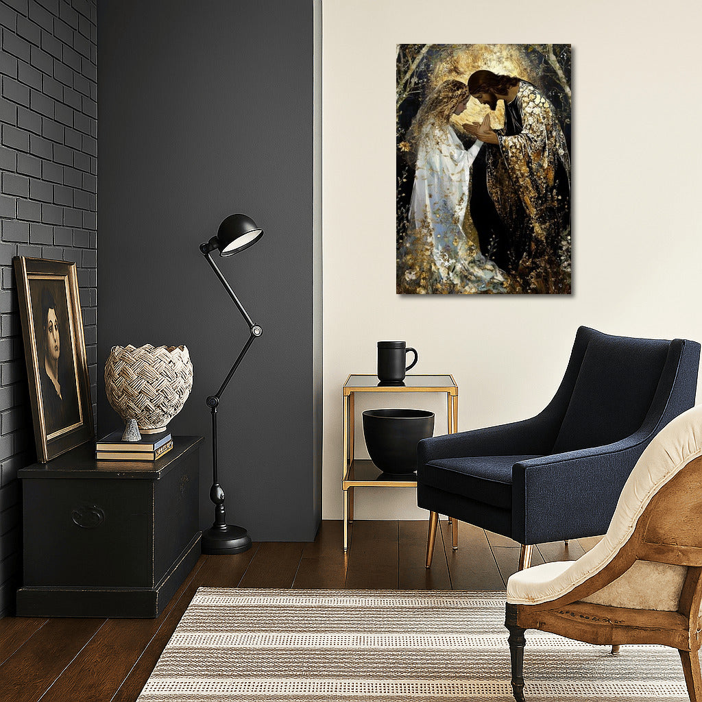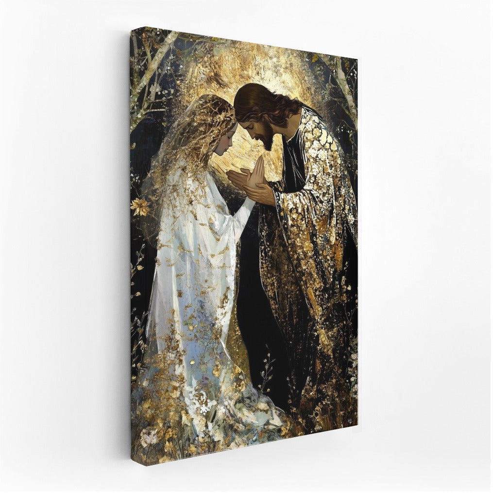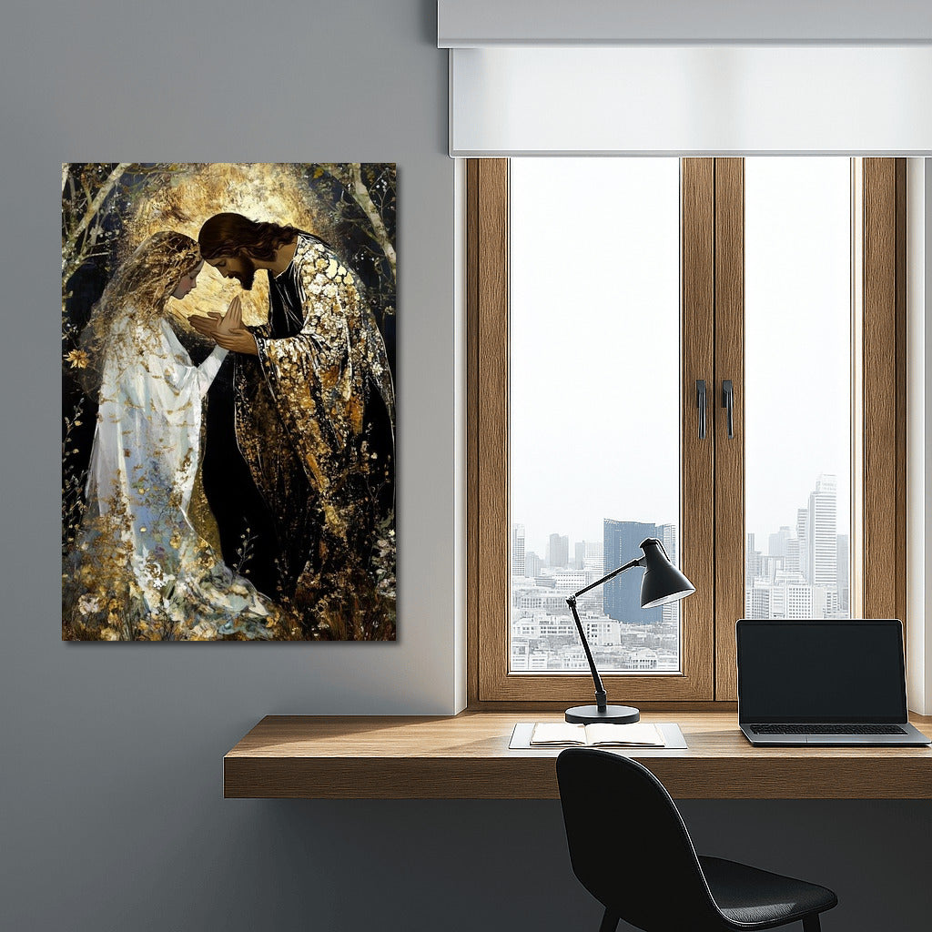 Mystical wall art: two people in the glitter of gold and light. Dive into the world where dreams and reality meet. See more from the collection: Christianity / Jesus Art