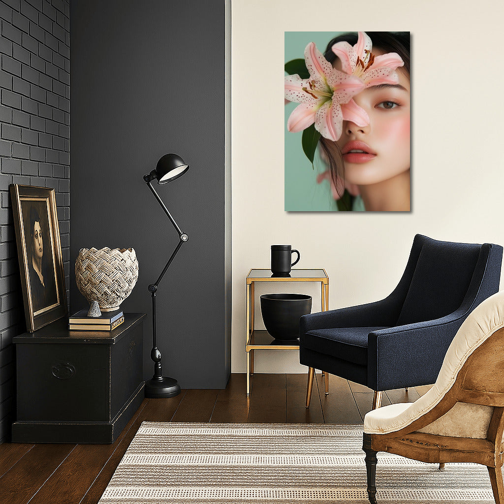Floral tenderness: poster with exquisite portrait and lilies. Art that will enliven your interior with unique elegance. See more from the collection: Wall Art with Women