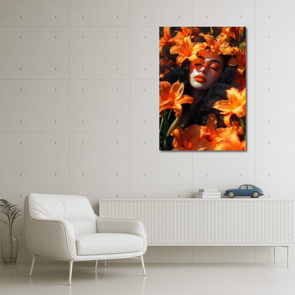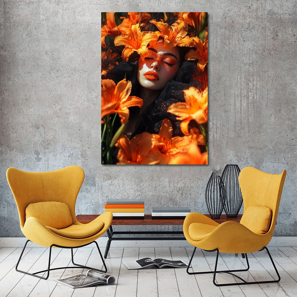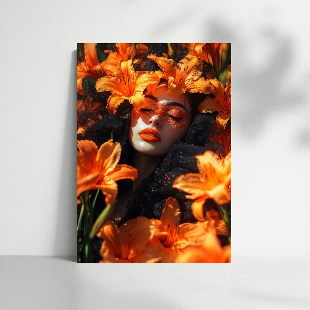 Magical wall art: a dreamy figure in lush lilies. A poster that will bring your interior to life with bright colors. See more from the collection: Wall Art with Women