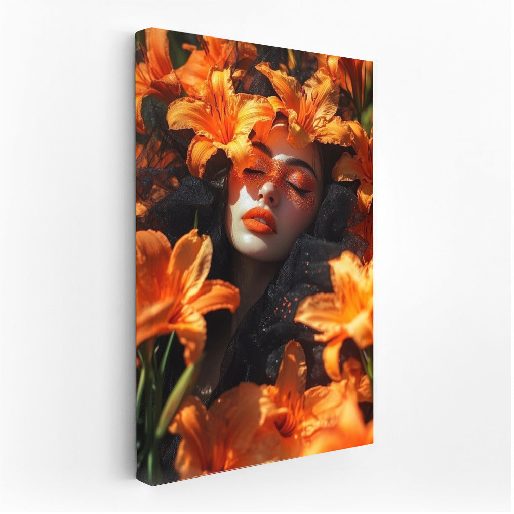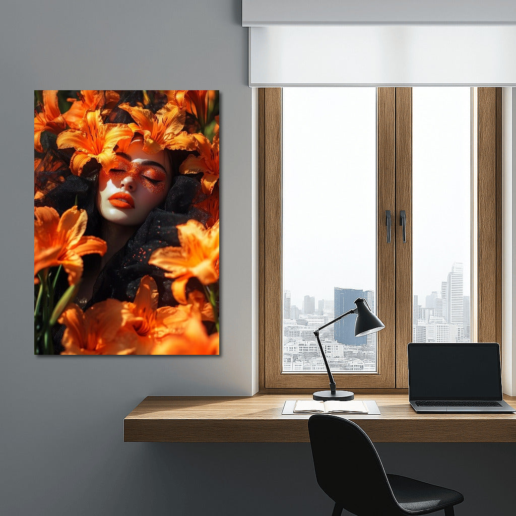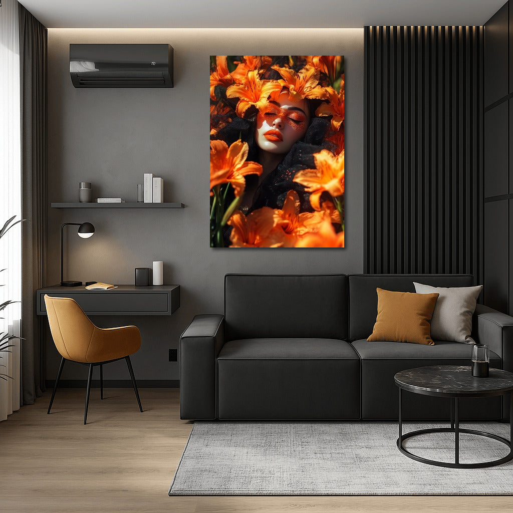 Magical wall art: a dreamy figure in lush lilies. A poster that will bring your interior to life with bright colors. See more from the collection: Wall Art with Women
