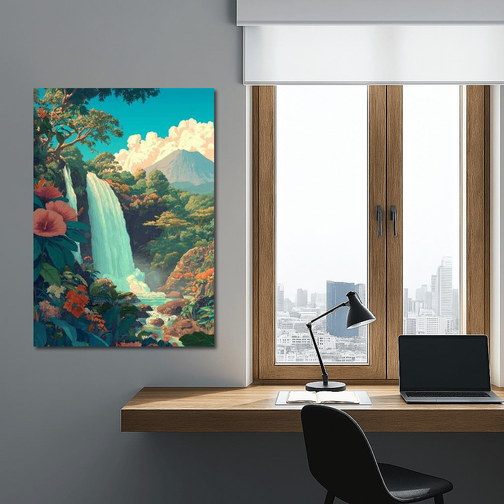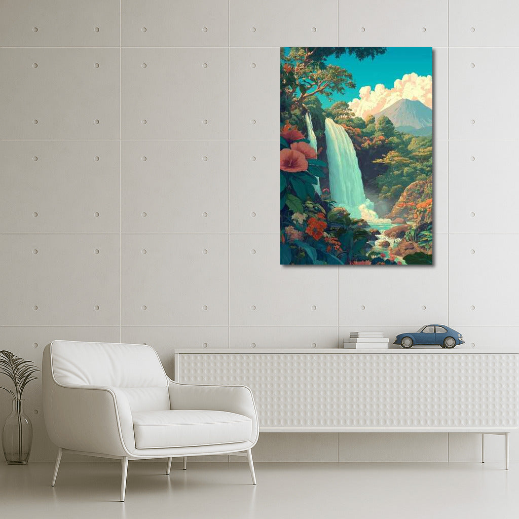 A waterfall among green jungle, flowers and mountains - a painting of nature, where every drop comes to life. A perfect poster for inspiration. See more from the collection: Nature & Landscapes Art