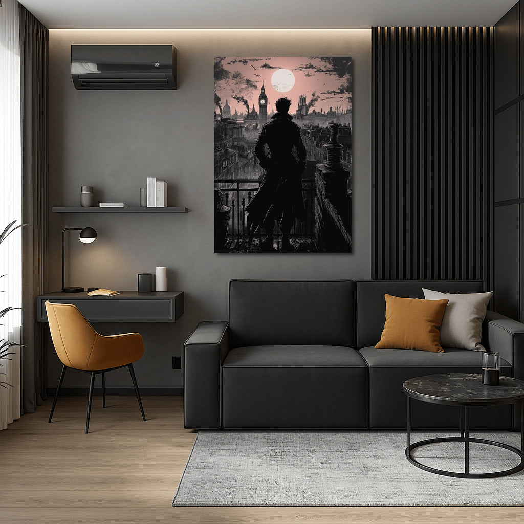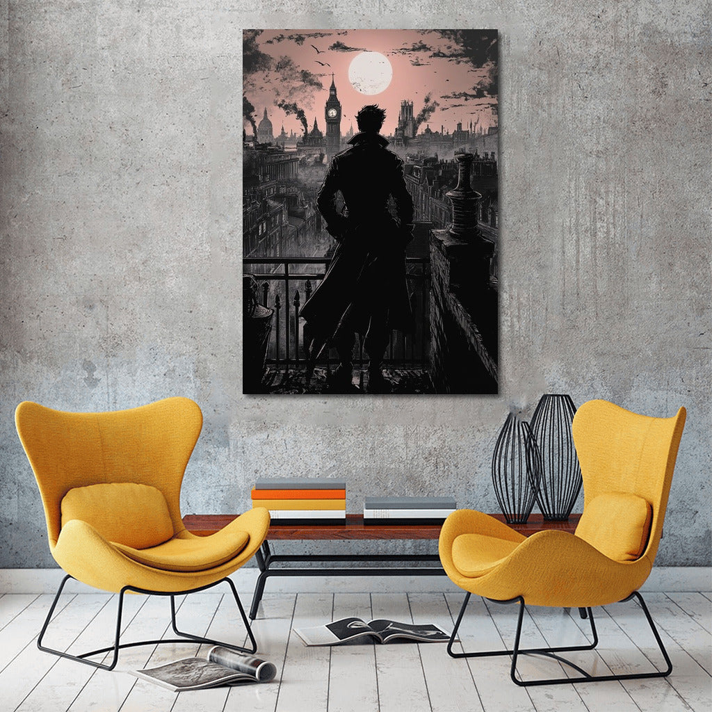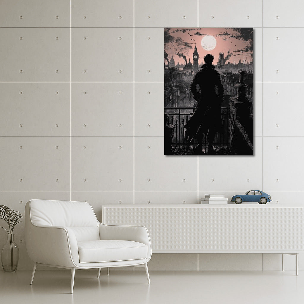 The secrets of the city at night are revealed on the poster: a mysterious figure looks at the majestic London under the moon. Noir style wall art. See more from the collection: Mixed Wall Art