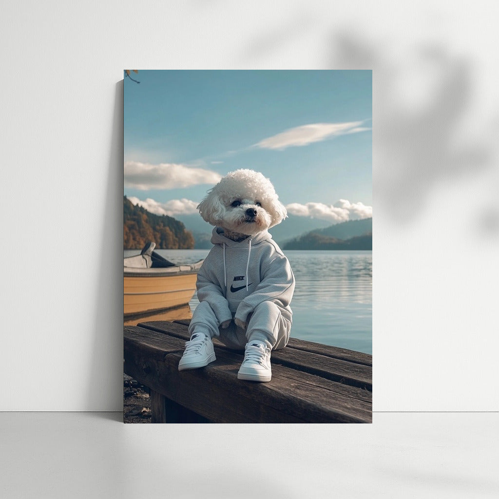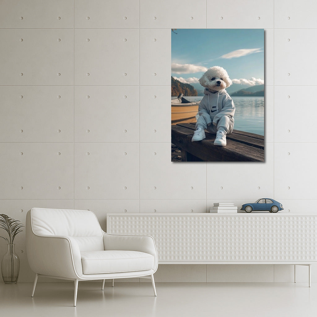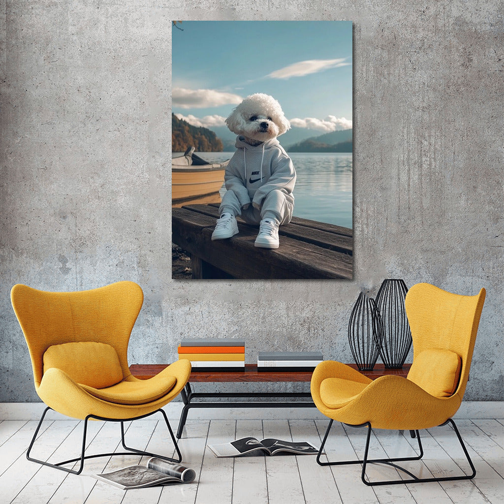 A graceful poster of a dog in stylish clothes against the backdrop of a lake. Perfect wall art to smile and inspire you every day! See more from the collection: Animals Art