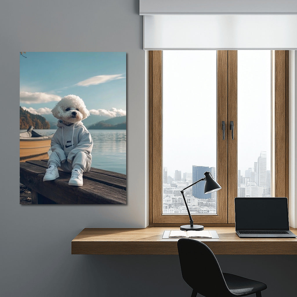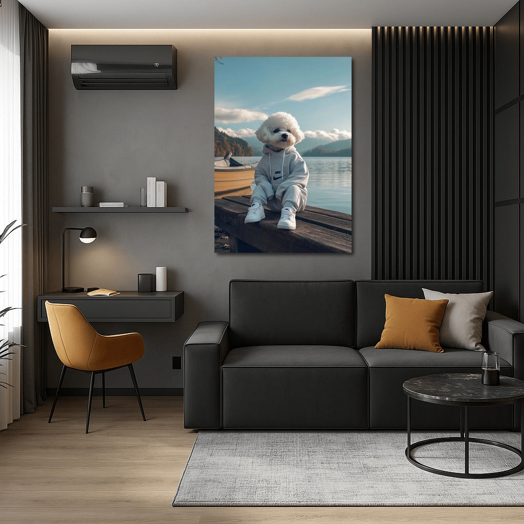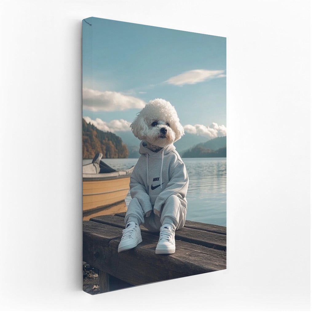 A graceful poster of a dog in stylish clothes against the backdrop of a lake. Perfect wall art to smile and inspire you every day! See more from the collection: Animals Art