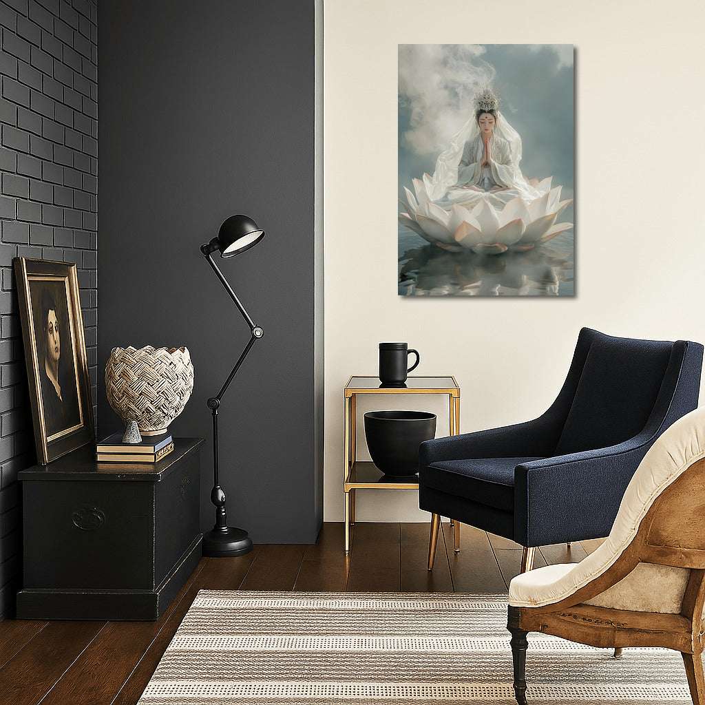 Ethereal tranquility in art: a mysterious figure in the clouds on a lotus. Dive into dreams with this unique poster. See more from the collection: Mixed Wall Art