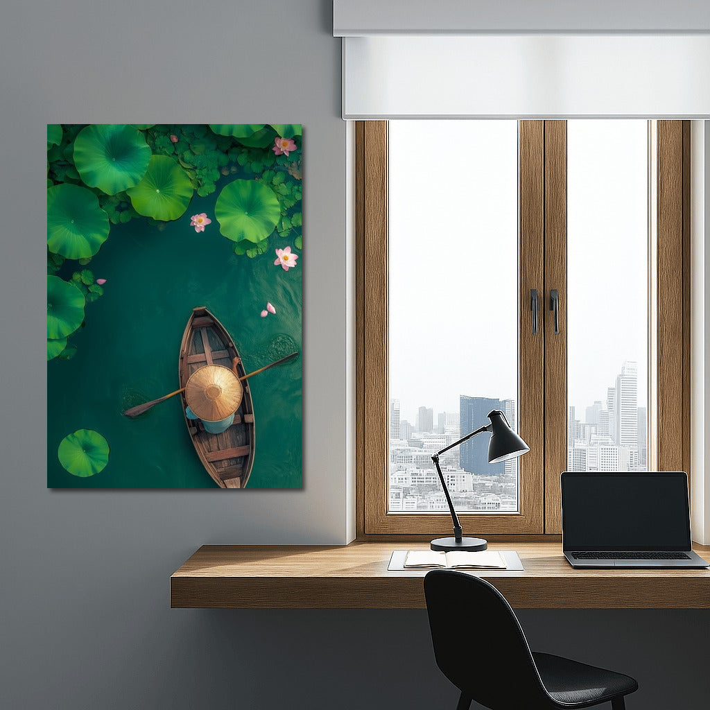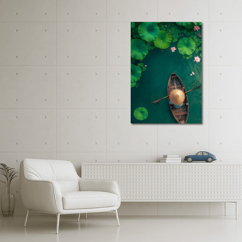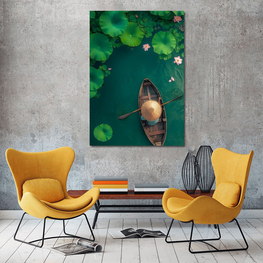 paintingsque painting of a girl in a boat floating among lotuses. Create an atmosphere of peace with this wall art. See more from the collection: Lakes & Rivers Art