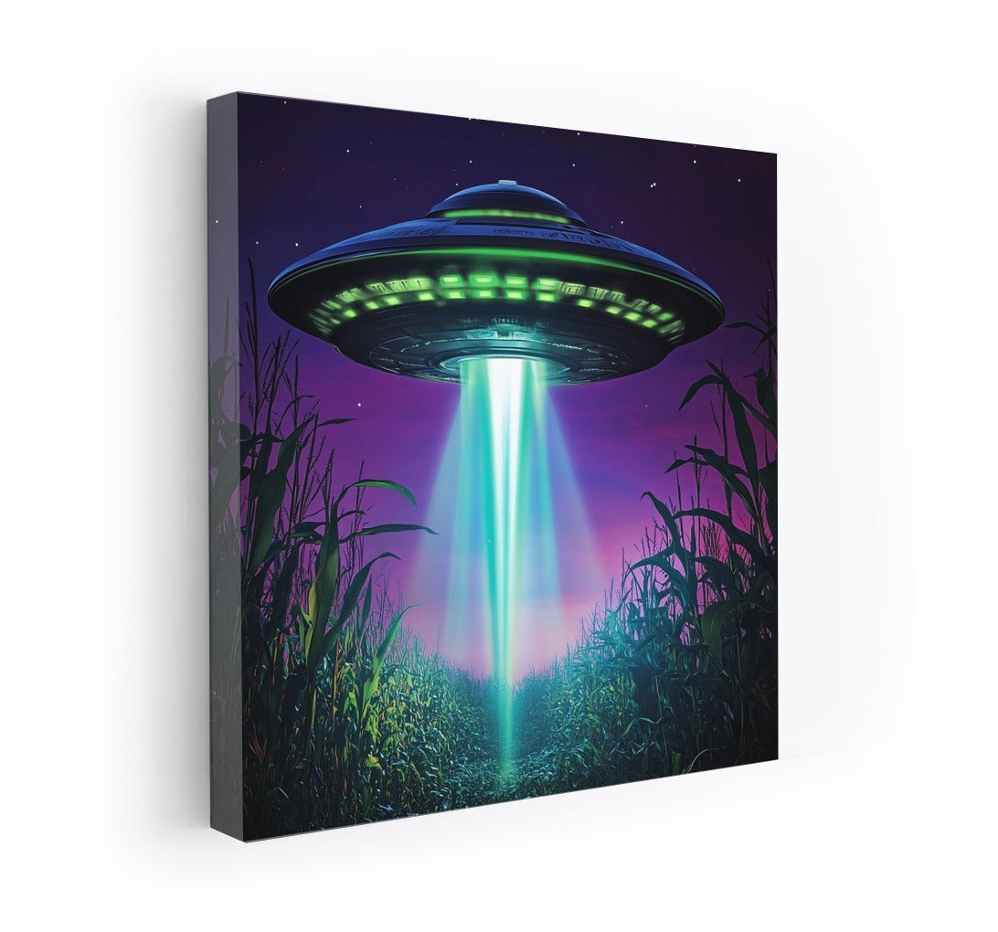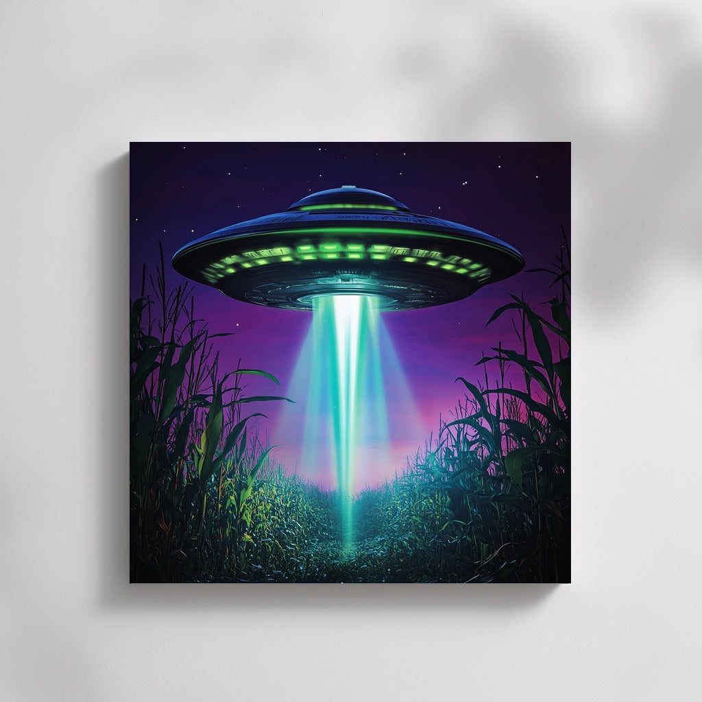 Alien Invasion: Mesmerizing UFO poster over a night field. Add mystery and space magic to your wall art! See more from the collection: Mixed Wall Art