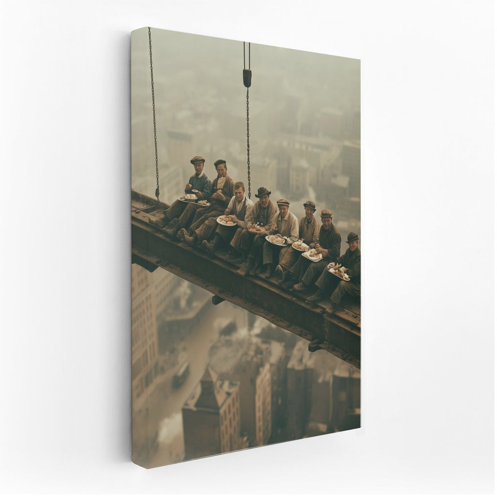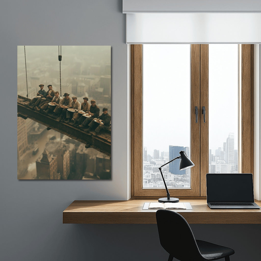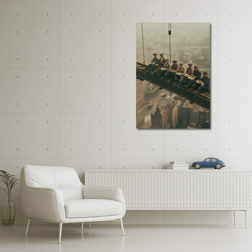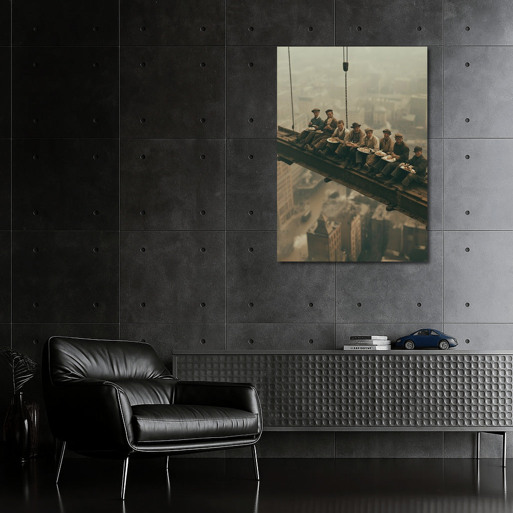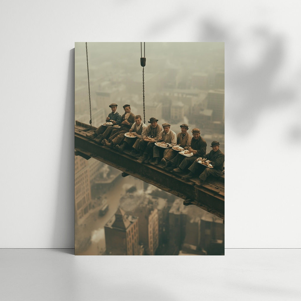 Bold wall art: workers at height, eating lunch above the city, create a captivating atmosphere in this unique poster. See more from the collection: Cityscapes & Skylines Art