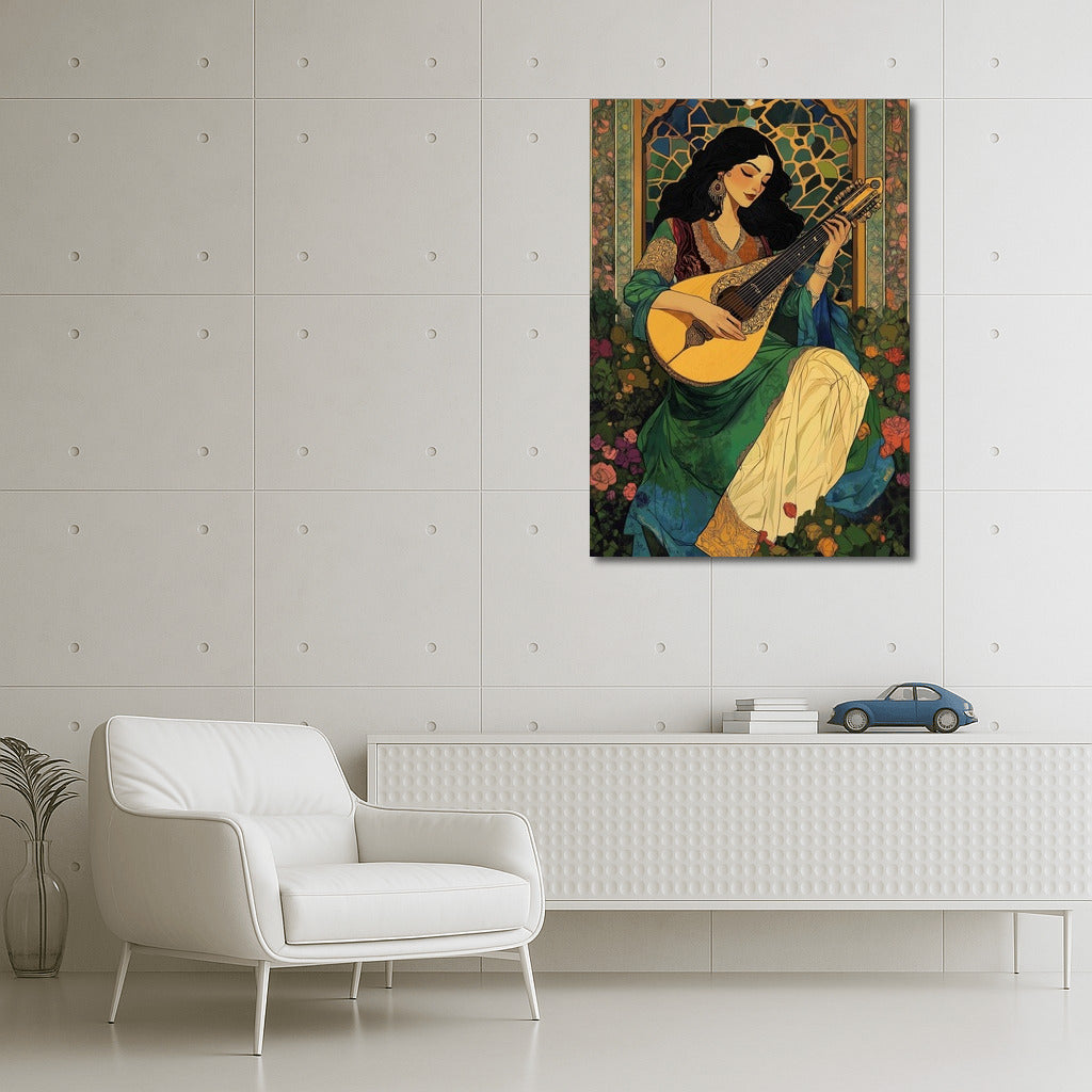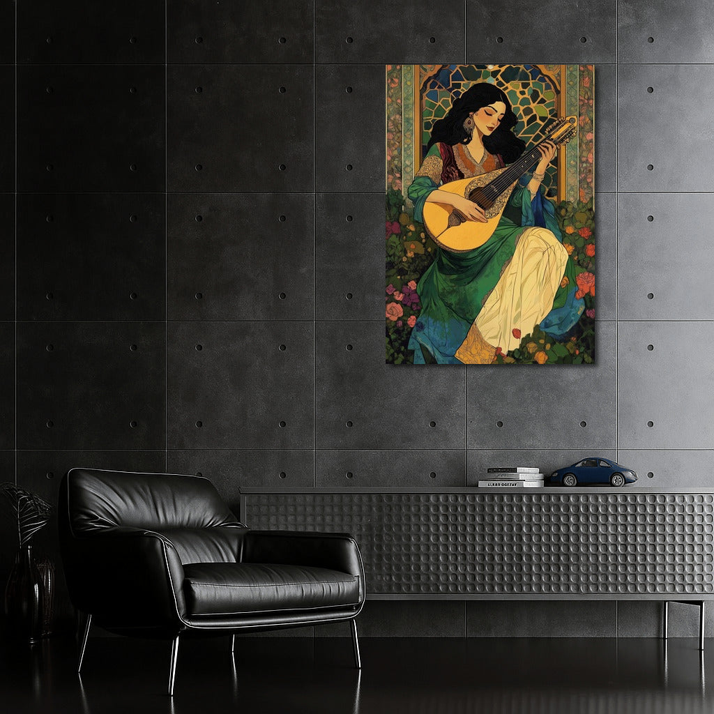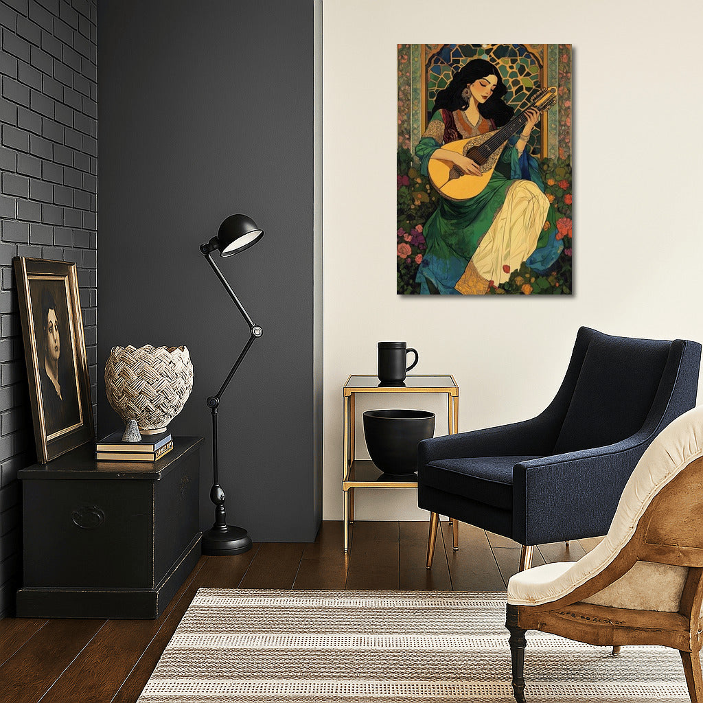 A charming play of light and shadow on the poster: a mysterious figure with a lute among floral patterns. Wall art full of harmony. See more from the collection: Mixed Wall Art