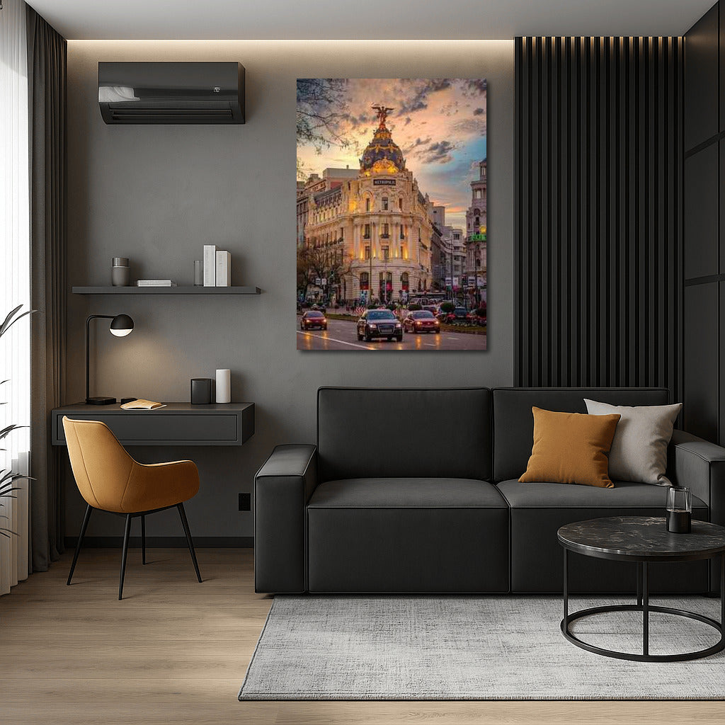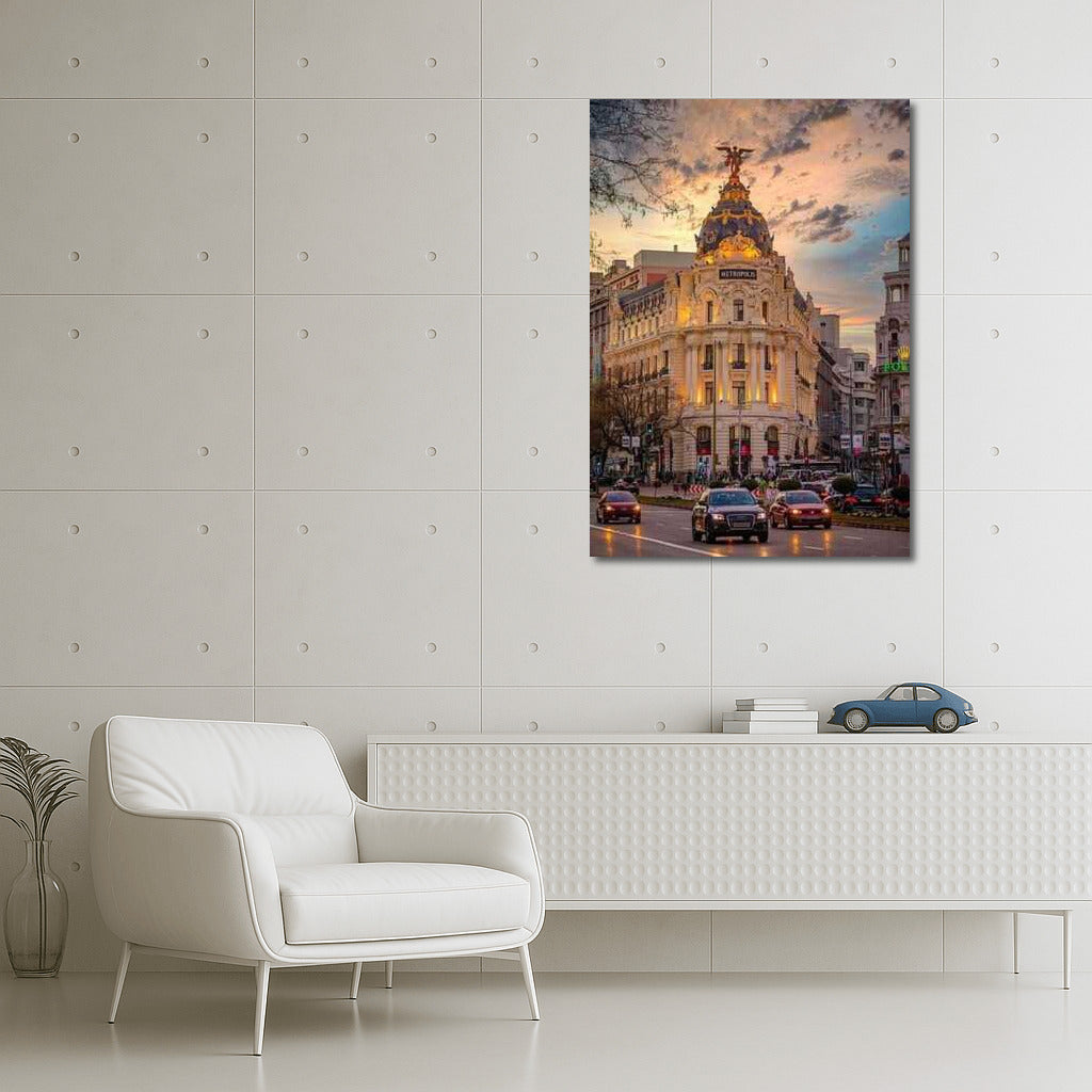 Poster with the magic of Madrid at night: the elegant Metropolis, the lights of the Audi convey the essence of the enchanting spirit of Spain. Wall art. See more from the collection: Country Art