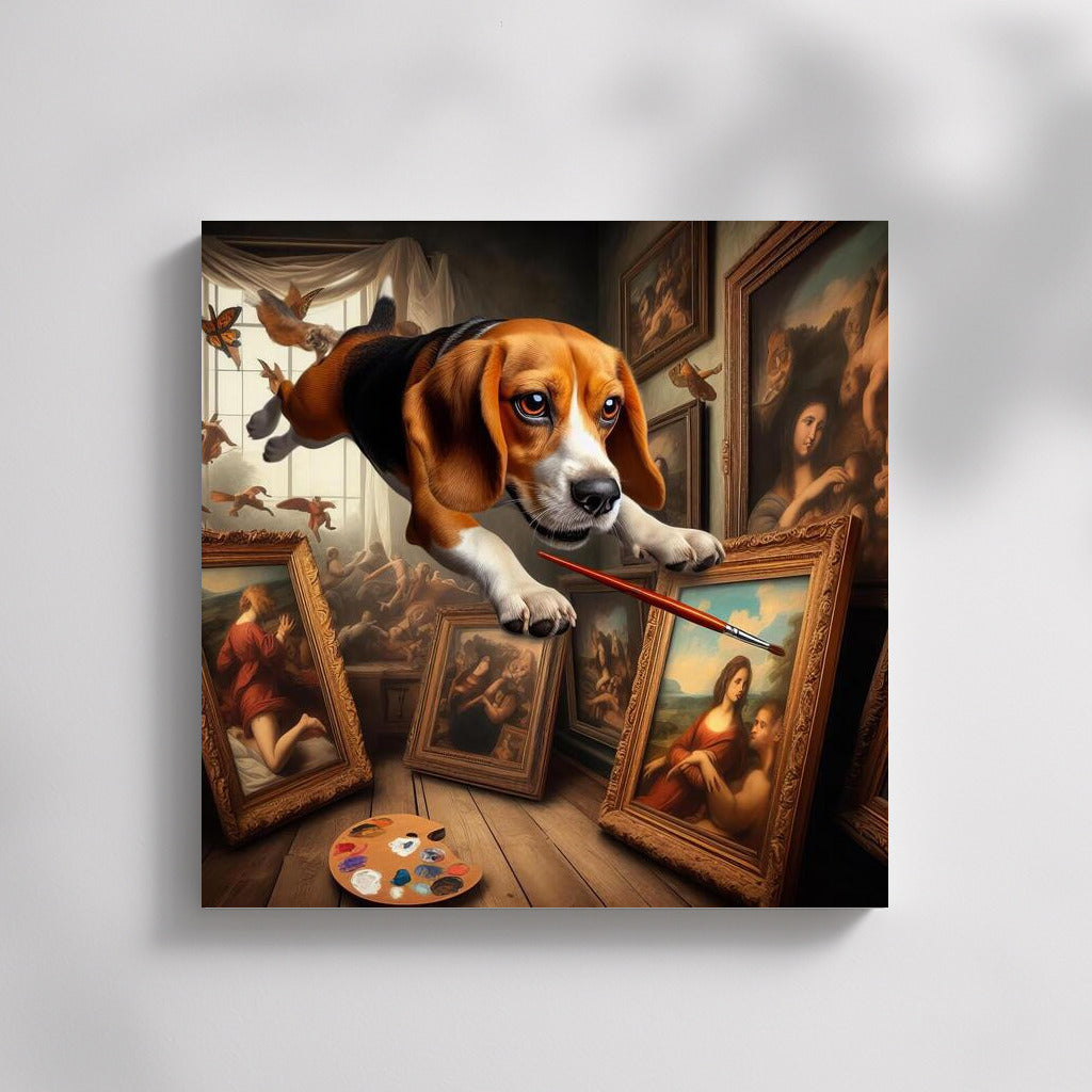 The magical beagle brings paintings to life by jumping on masterpieces of art! Add dynamics to your wall art! See more from the collection: Animals Art