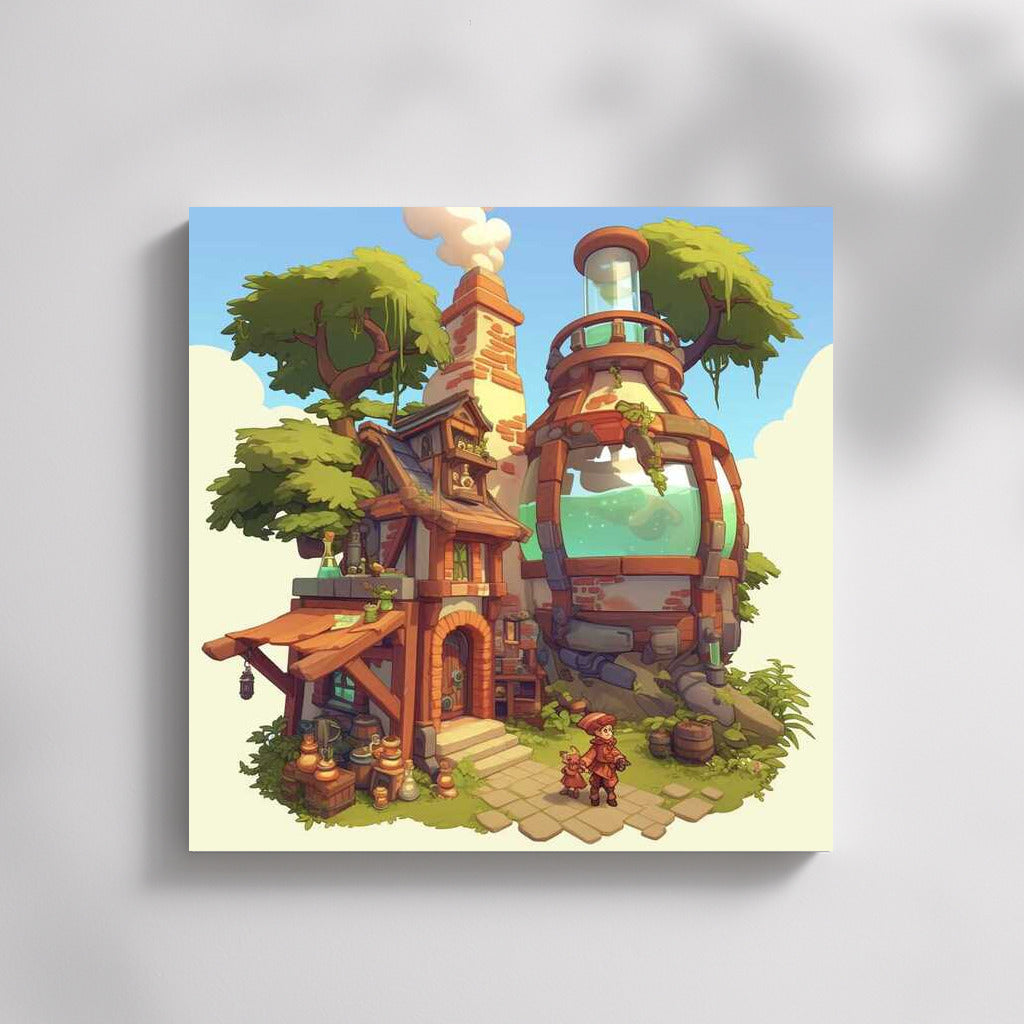 Dive into the world of Fantasy with this painting: a magical house where trees grow on the roofs and magic is in the air! See more from the collection: Fantasy Art