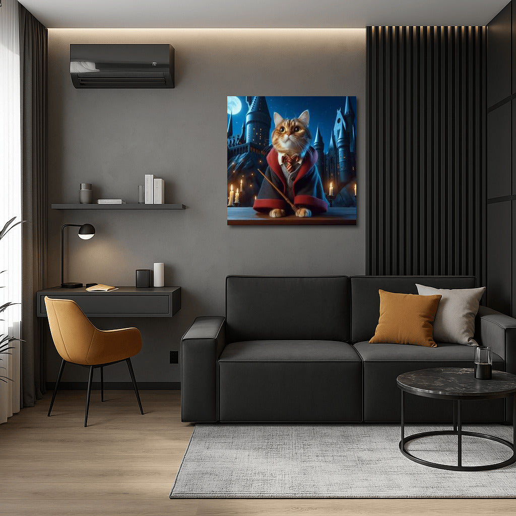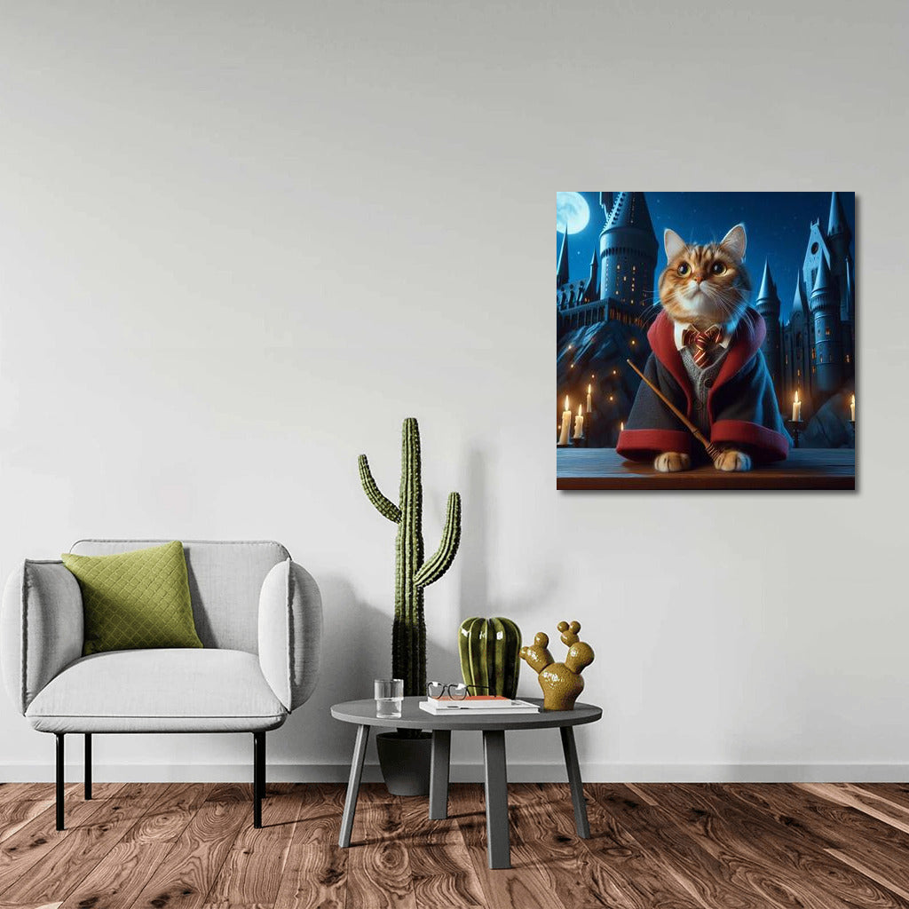 Mysterious magic comes to life on the poster: a cat in a robe and with a magic wand stands in front of Hogwarts. Wall art in the style of Harry Potter. See more from the collection: Animals Art