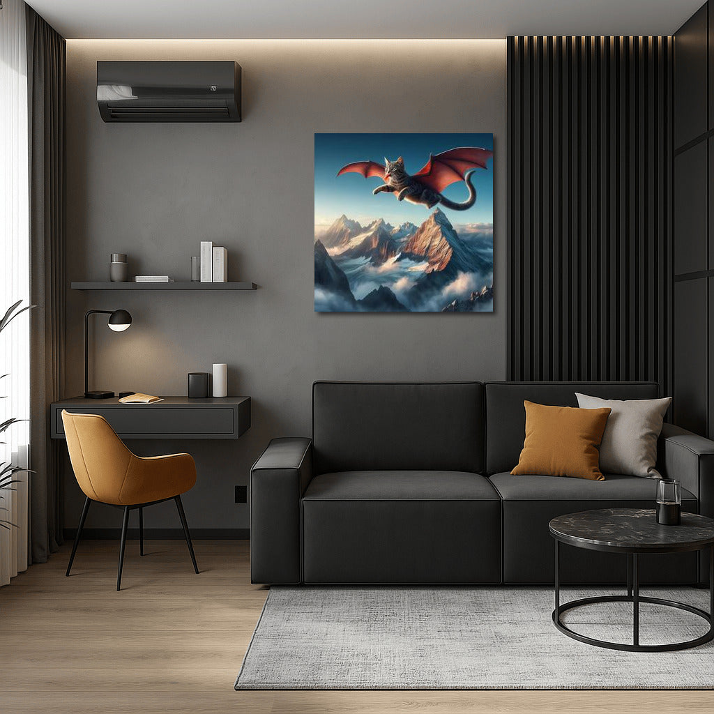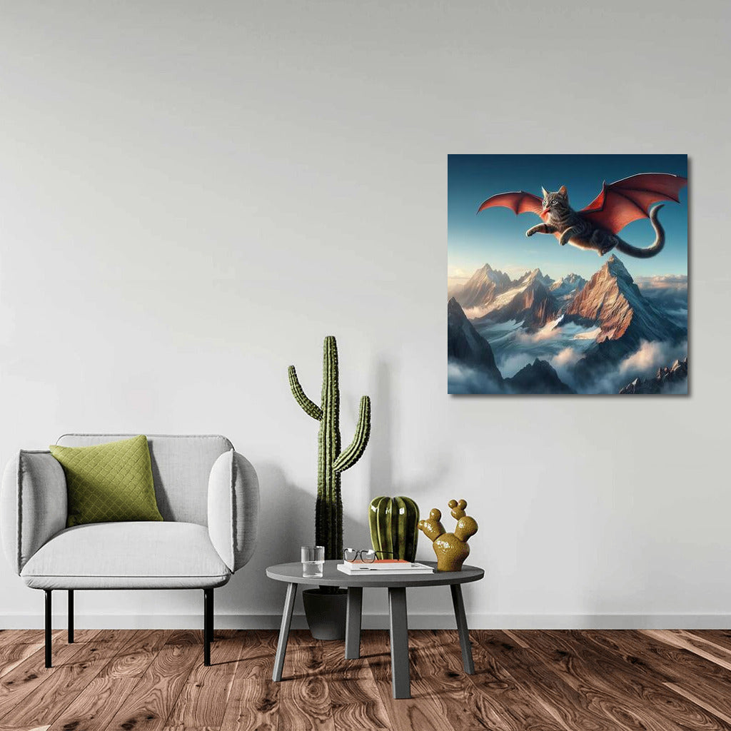 Poster with the plot A cat turned into a dragon soars above the mountain peaks. Magic and flight in one wall art! See more from the collection: Animals Art