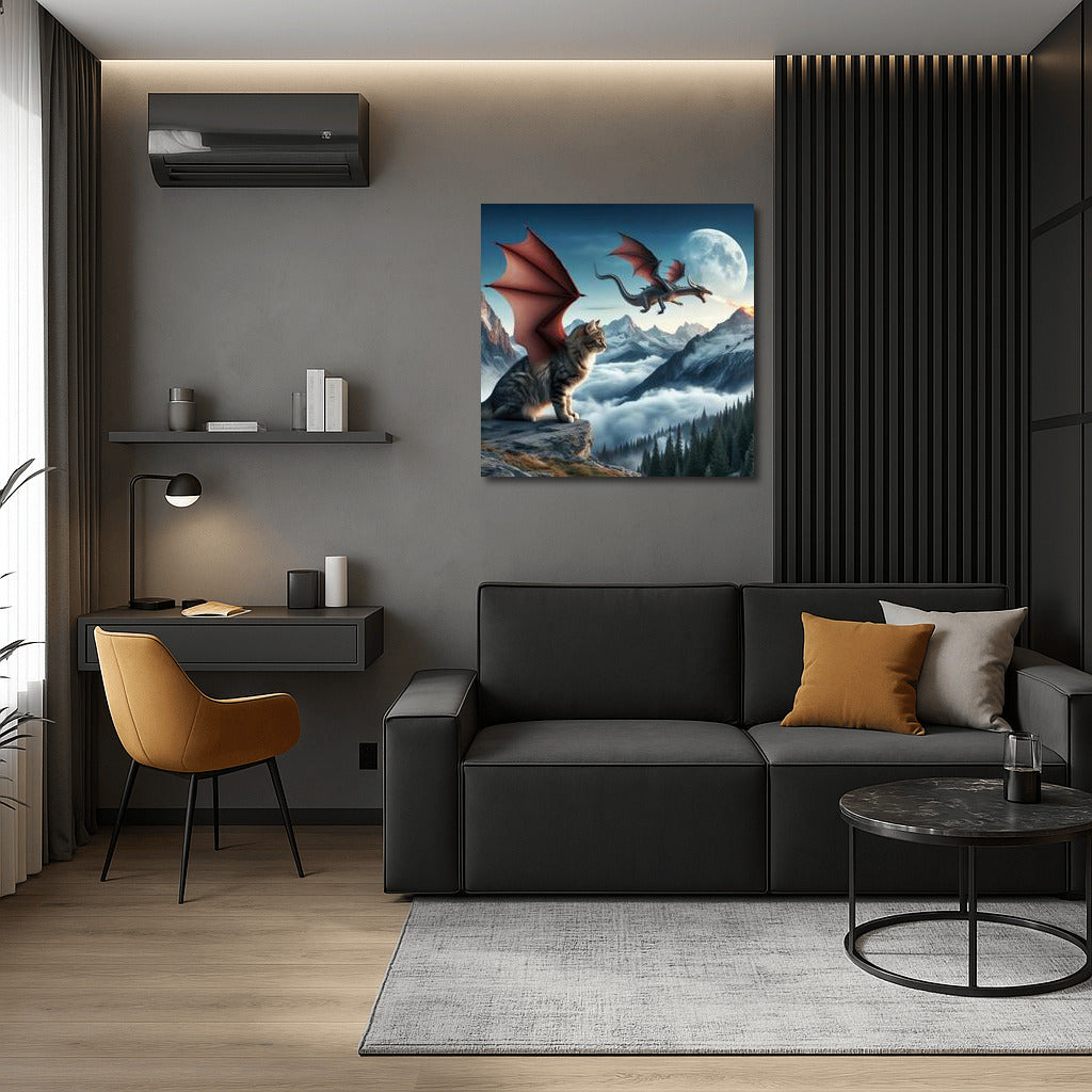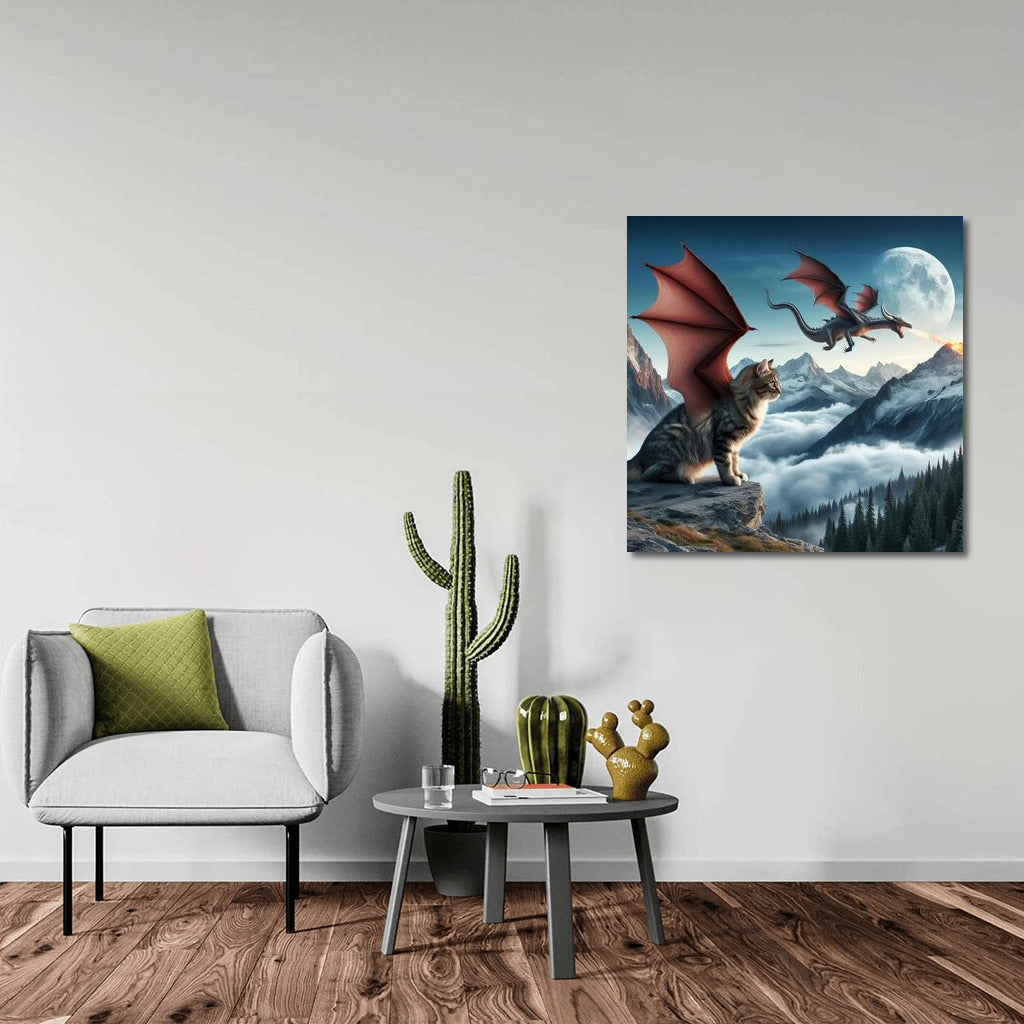Cat turns into a dragon and flies over mountain peaks - a magical poster for your home! Wall art that brings fantasy to life. See more from the collection: Animals Art