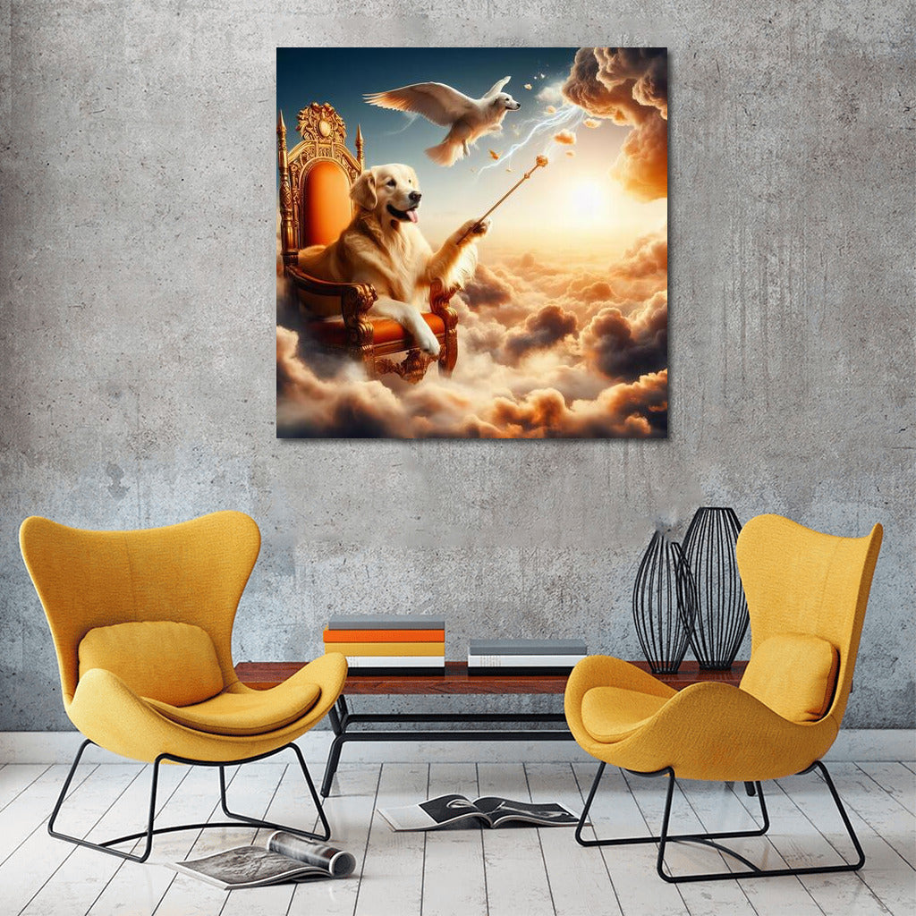 Magic Poster: Golden Retriever on the throne of clouds controls the weather with a magic wand. Magical wall art! See more from the collection: Animals Art